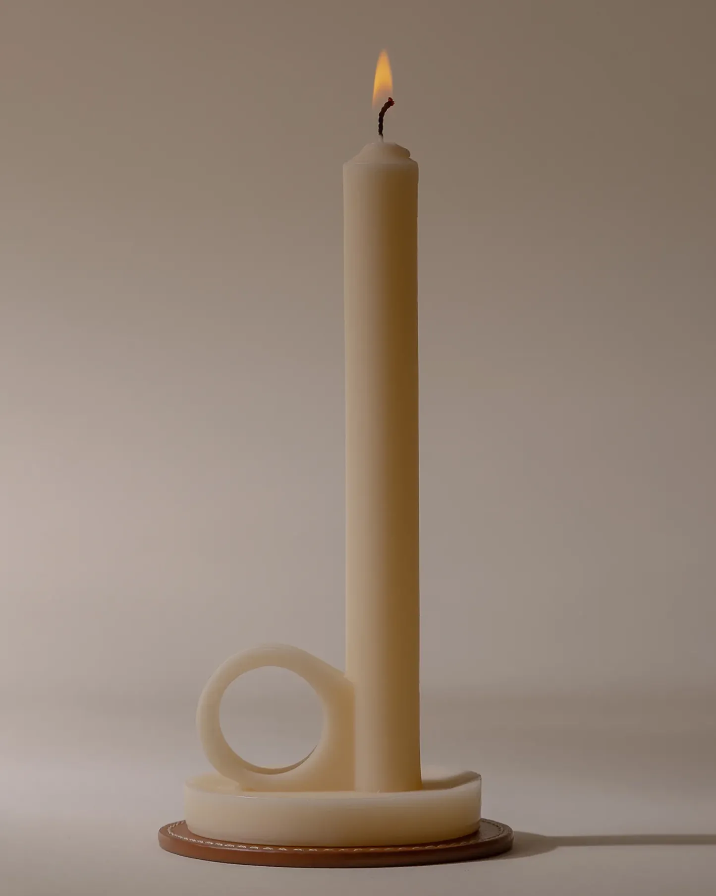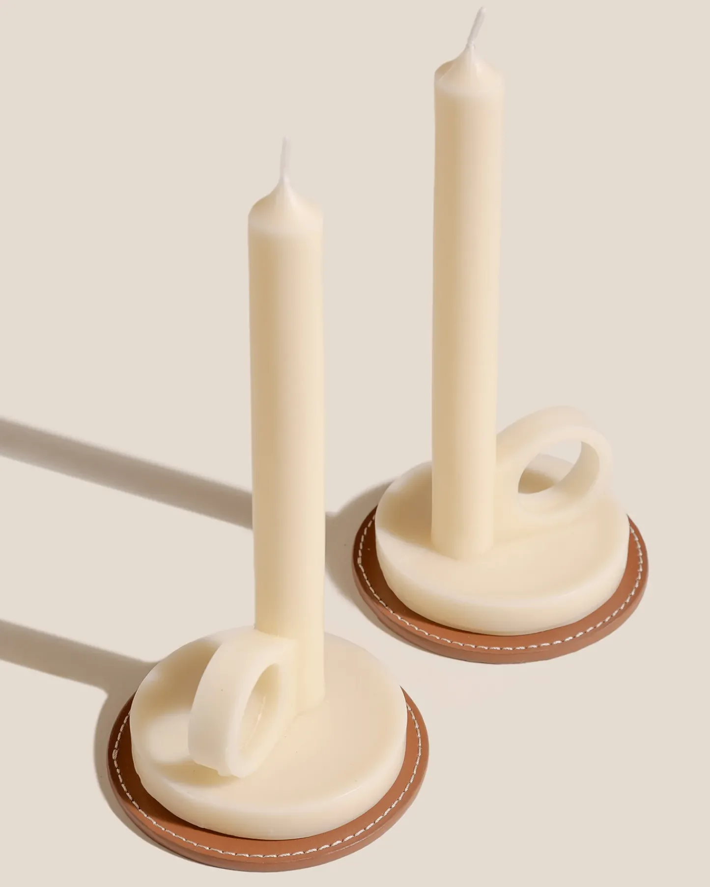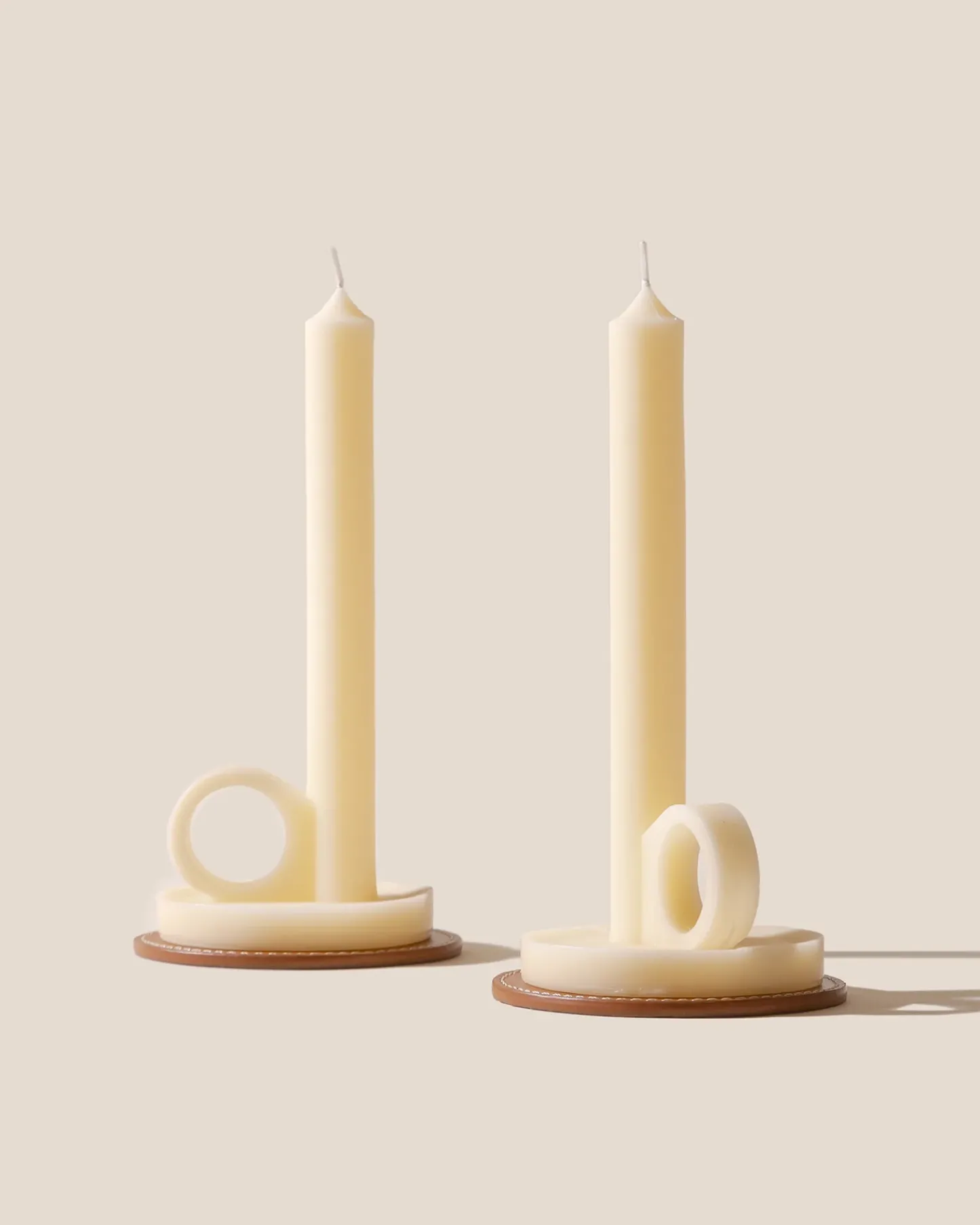 This set includes two mineral wax candles with vintage silhouette and two leather stands crafted to elevate them. Each piece is carefully made by talented Spanish artisans.