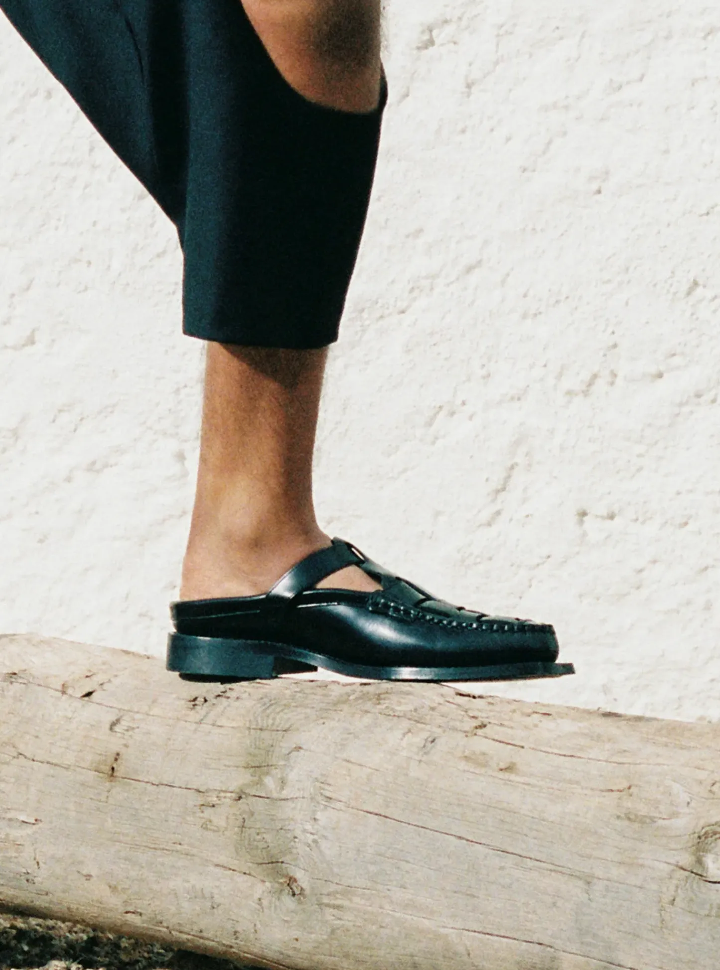 Woven t-bar mule loafer crafted in Spanish structured calf leather.