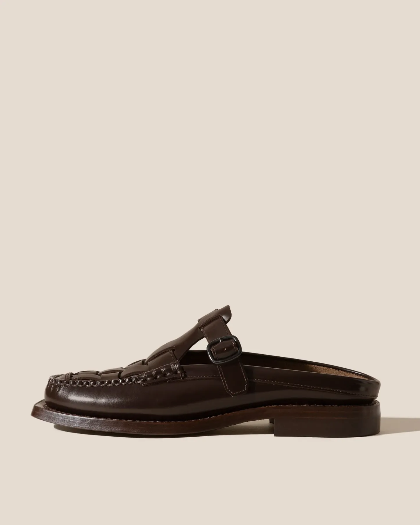Woven t-bar mule loafer crafted in Spanish structured calf leather.