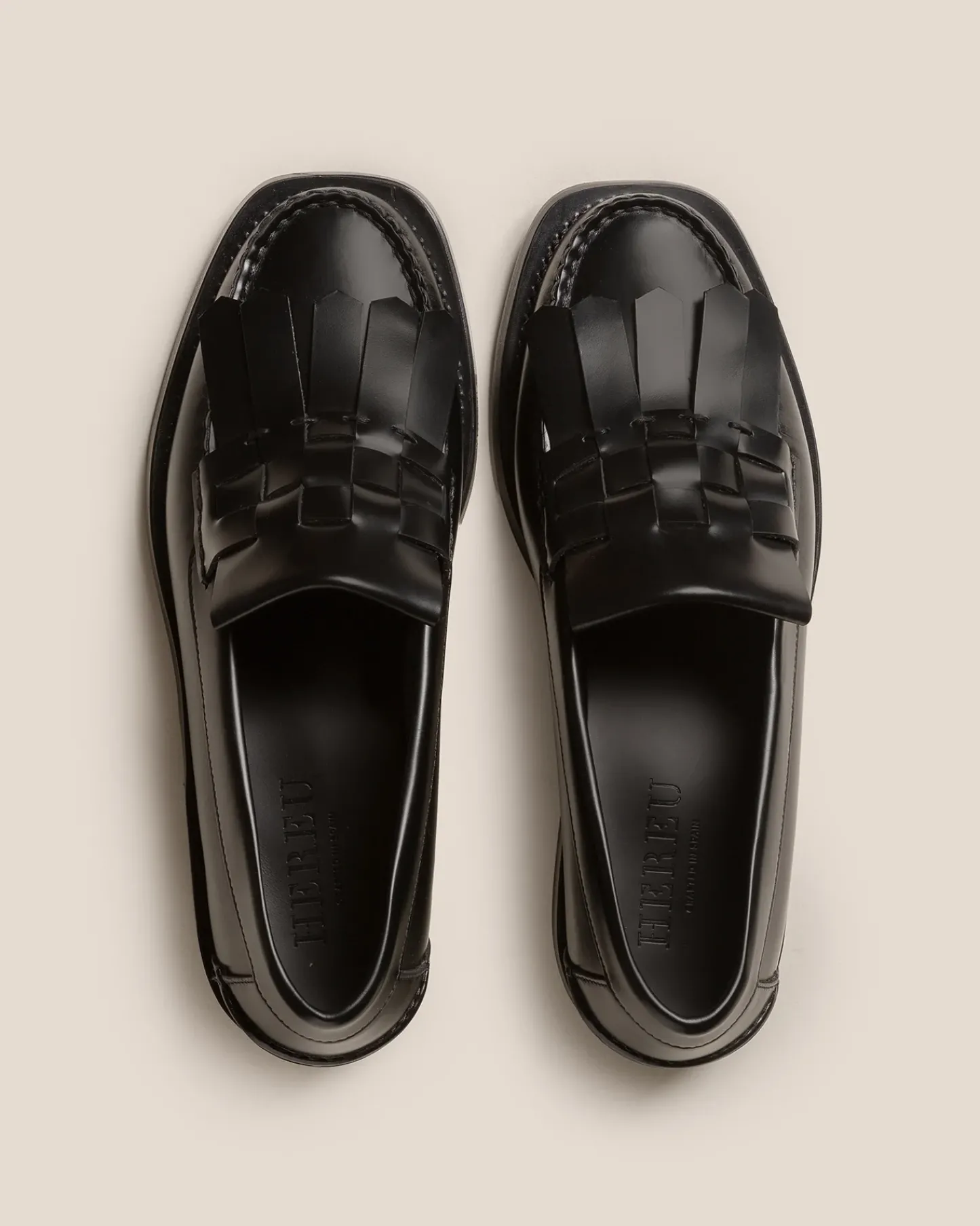 Slip-on loafer with interwoven fringes front detail crafted in structured calf.