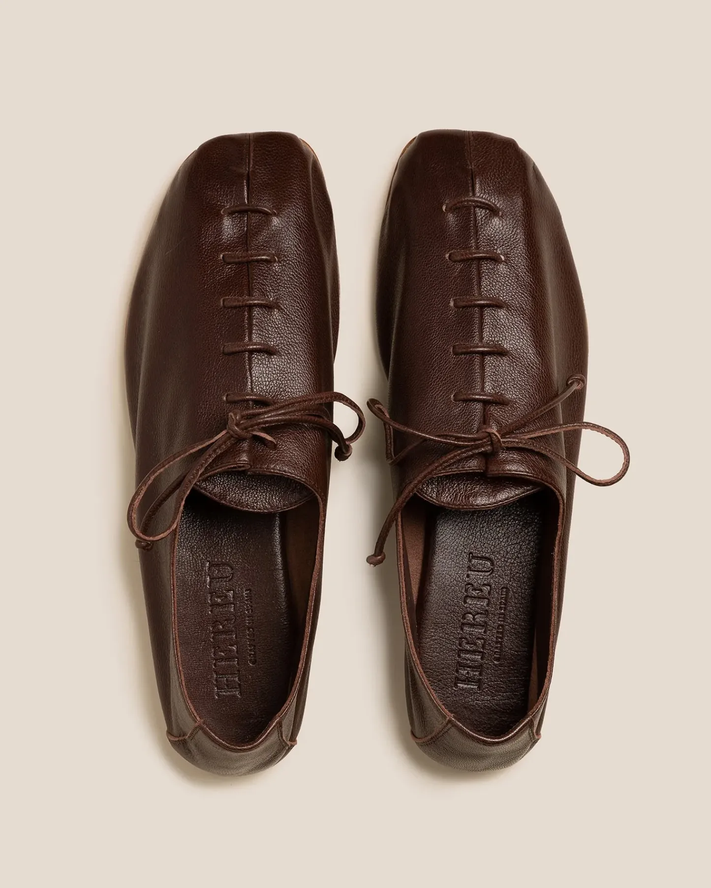 Round-toe flat lace-up shoe with bellows tongue (one piece), crafted in unlined supple shiny lambskin with matching leather laces.