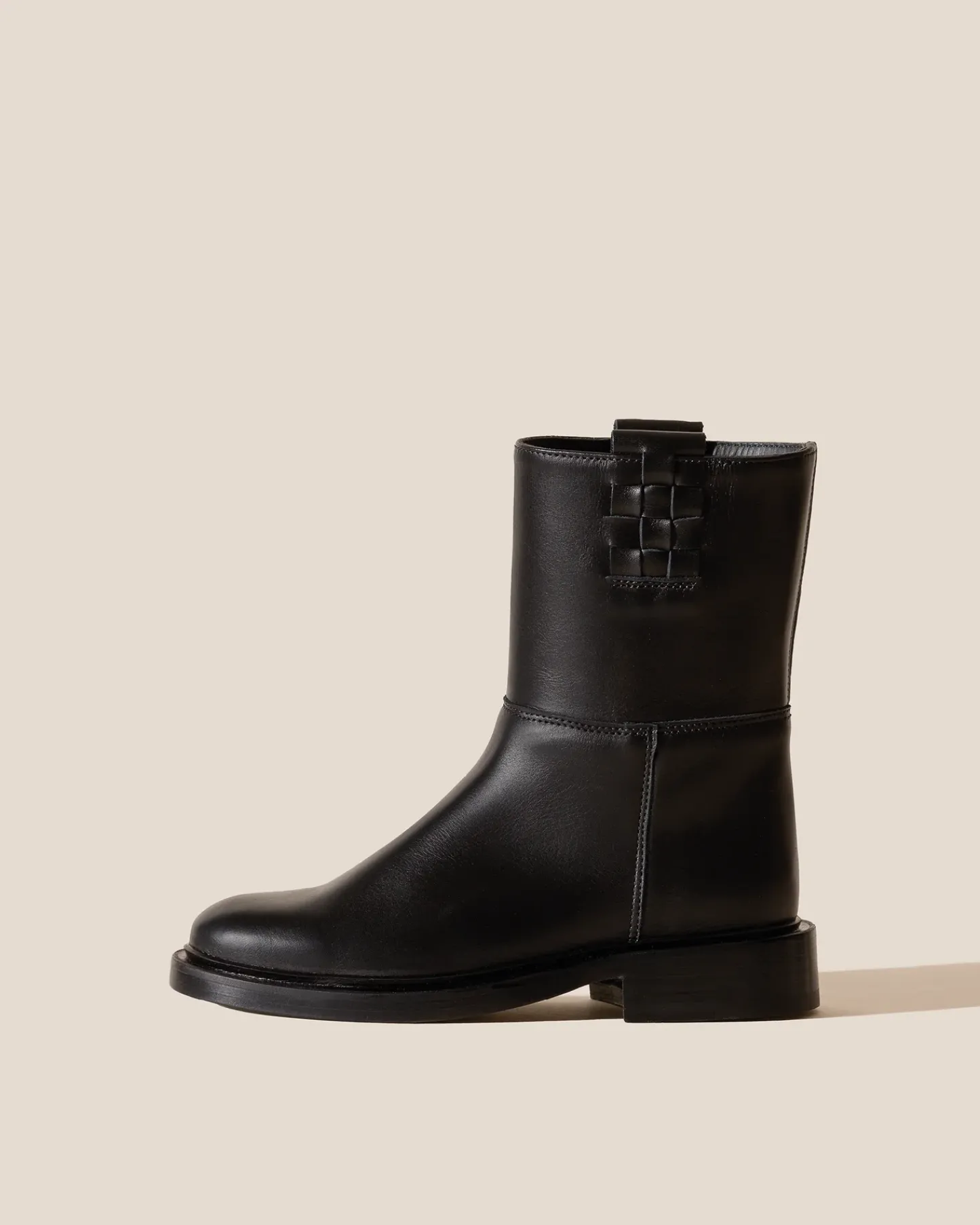 Mid calf pull-on boot with side interwoven detail. Crafted in Spanish calf leather and lined with calf leather lining.