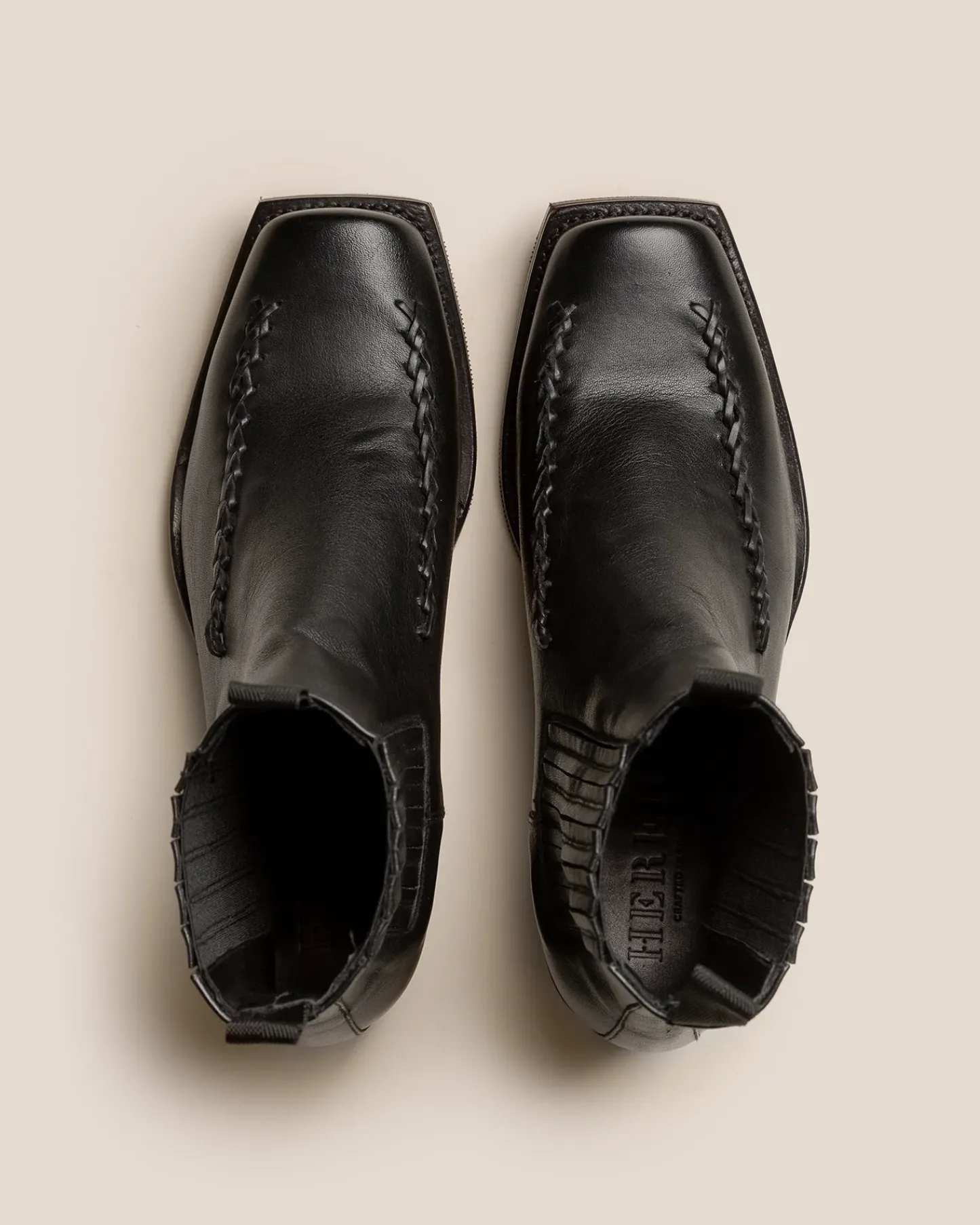 Square toe chelsea boot with braided details.