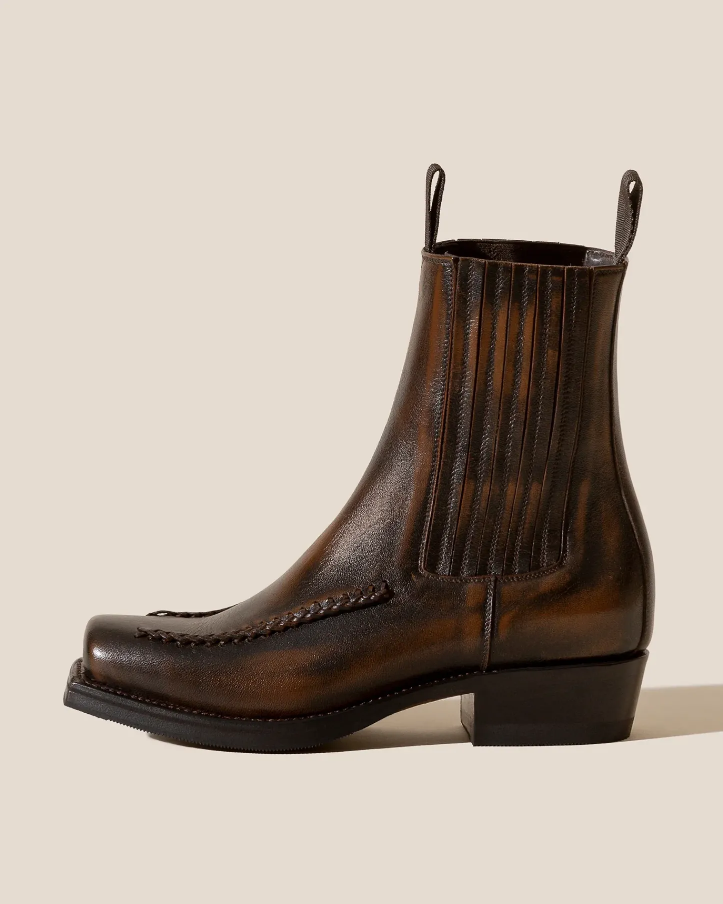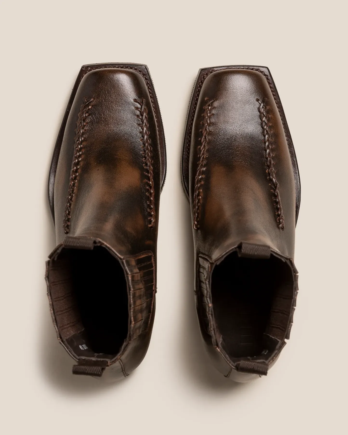 Square toe chelsea boot with braided details.