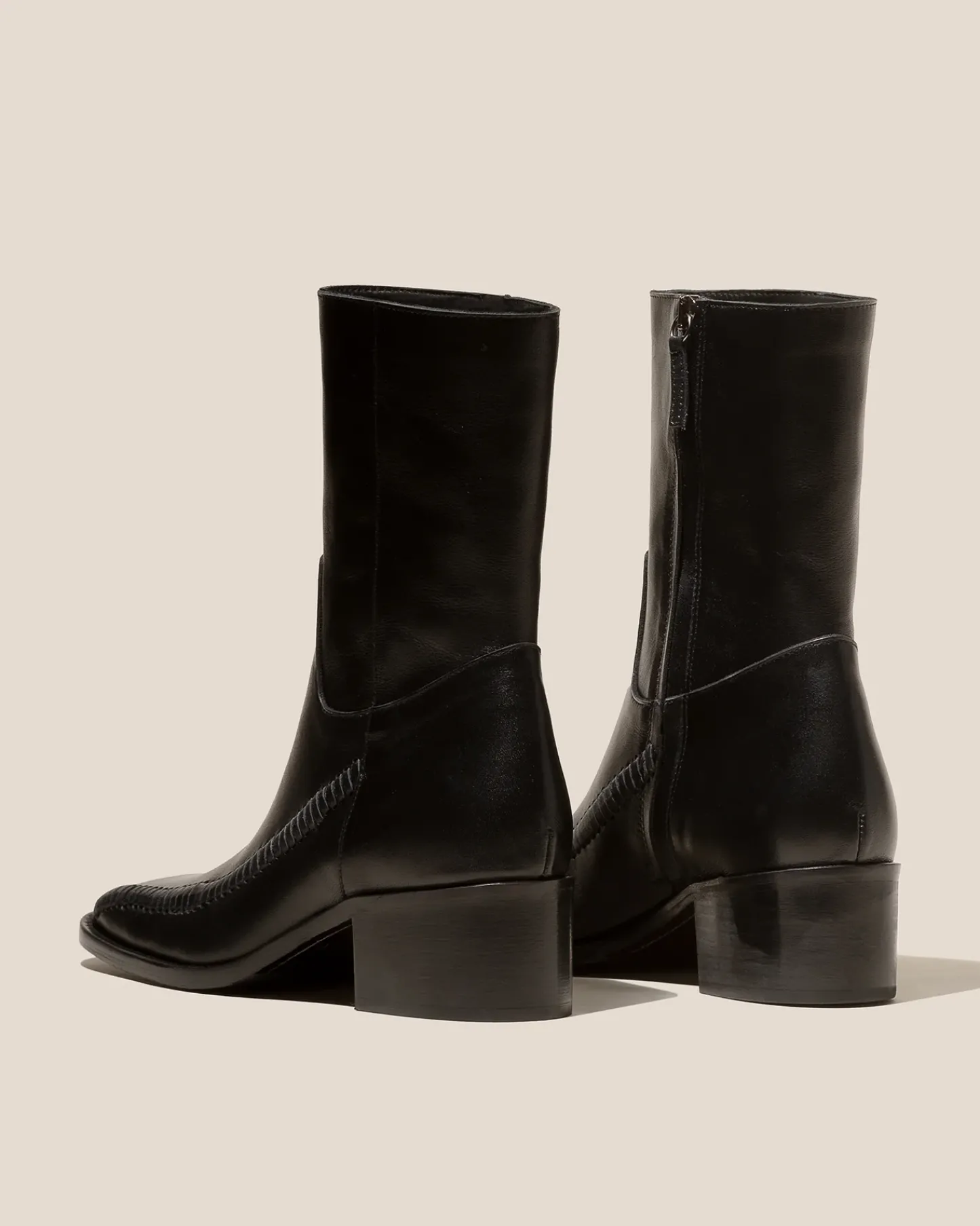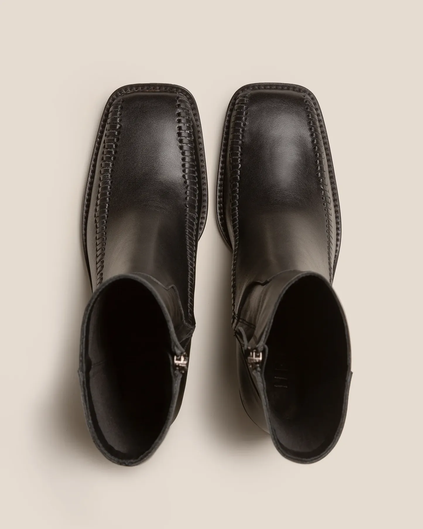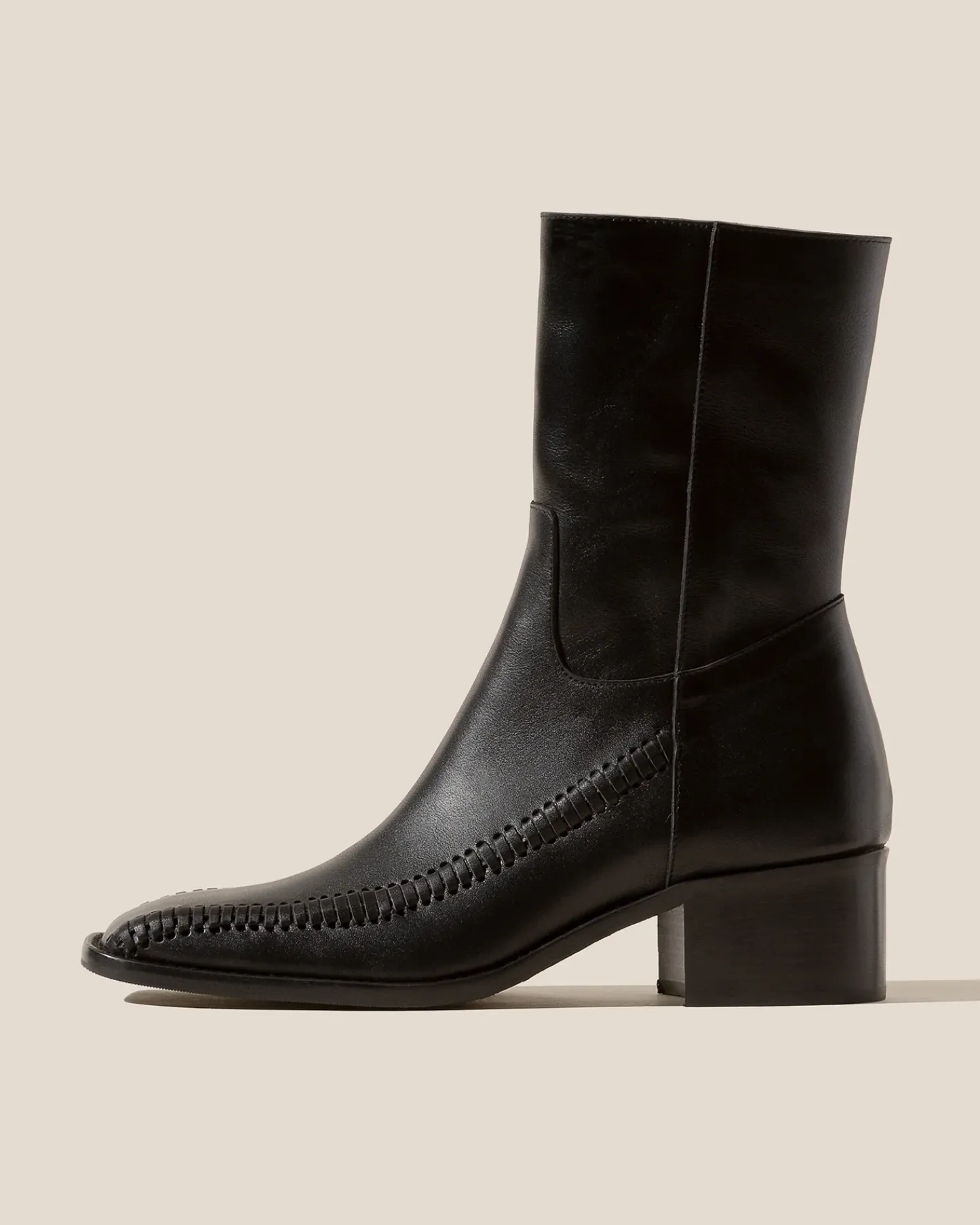 Square toe ankle boot with braided details, crafted in sheeny soft calf leather. The outsole is stitched to the upper for extra flexibility and durability.