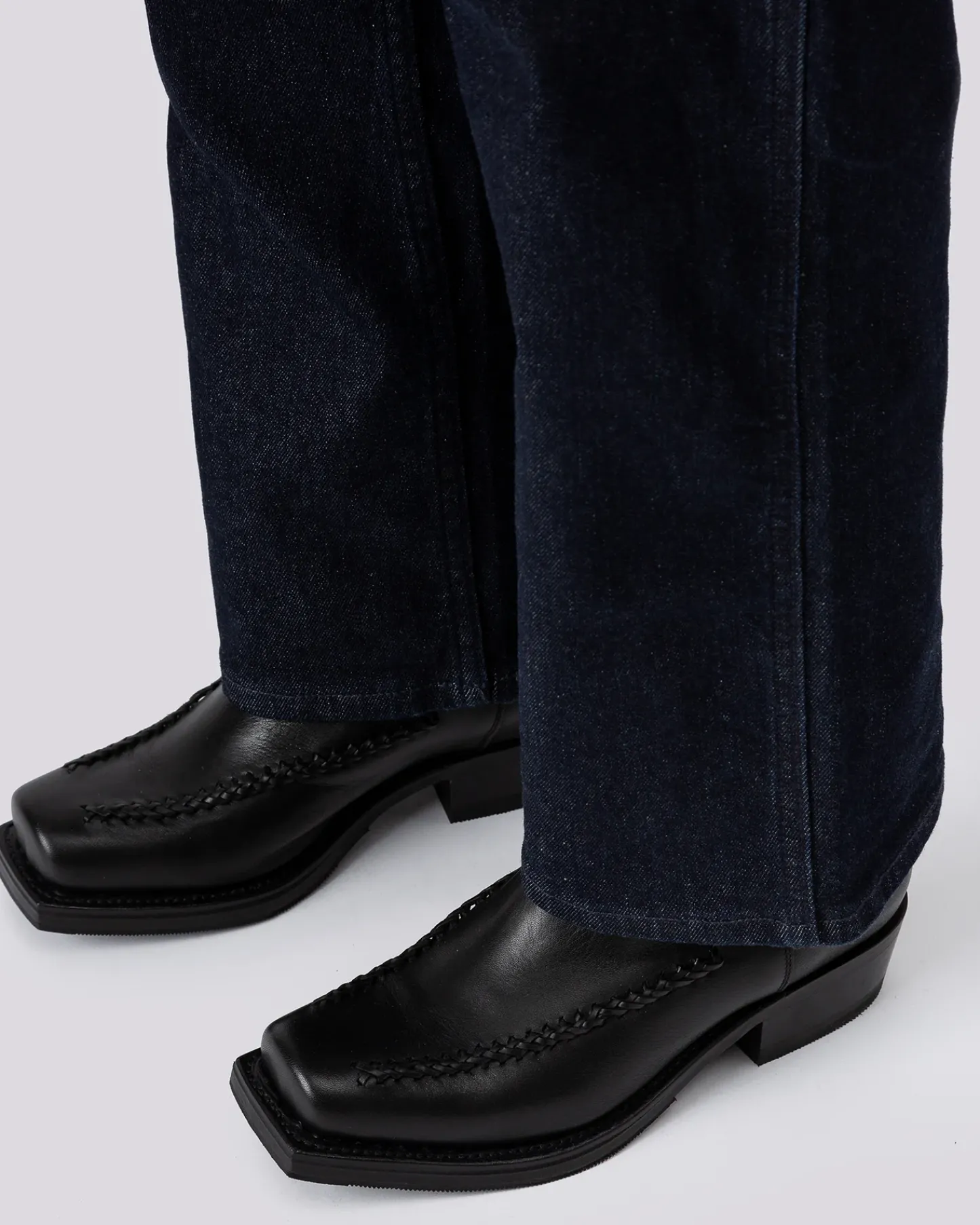 Heeled square-toe under-the-knee boot with braided details.