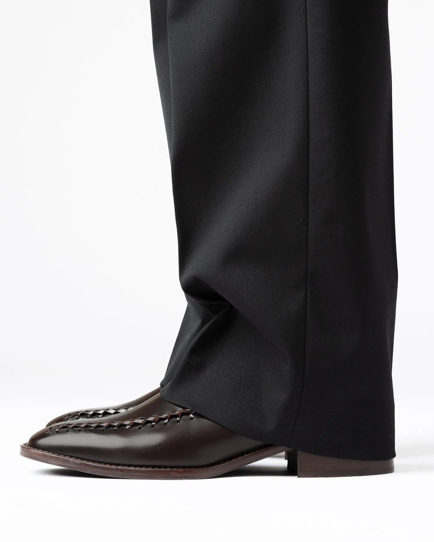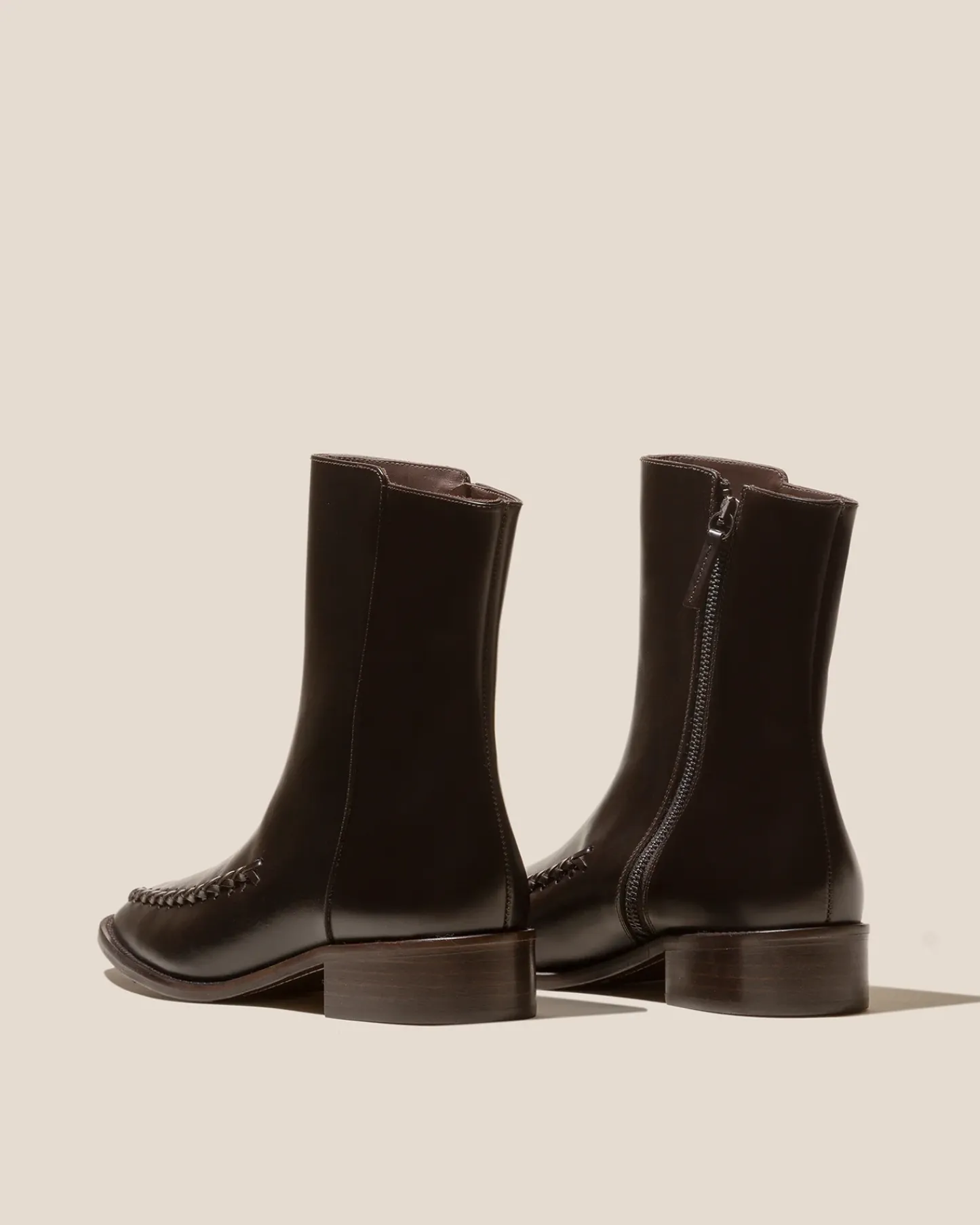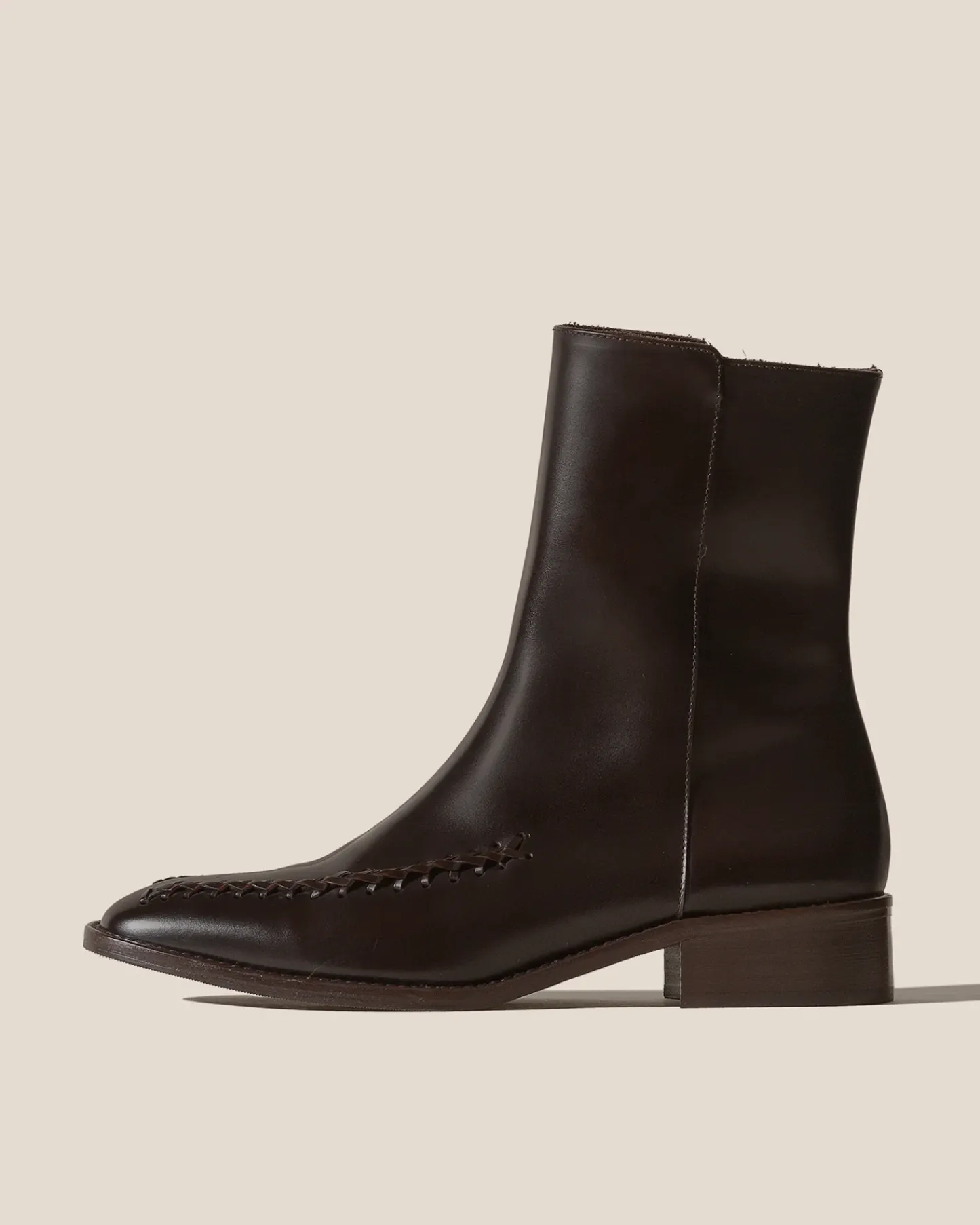 Almond toe mid calf boot with braided details, crafted polished structured calf leather.