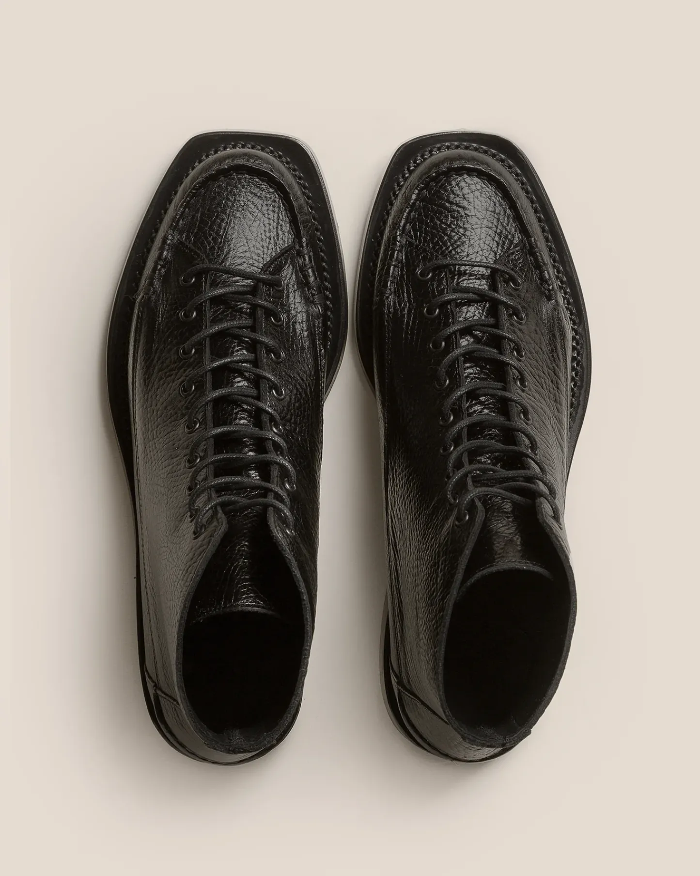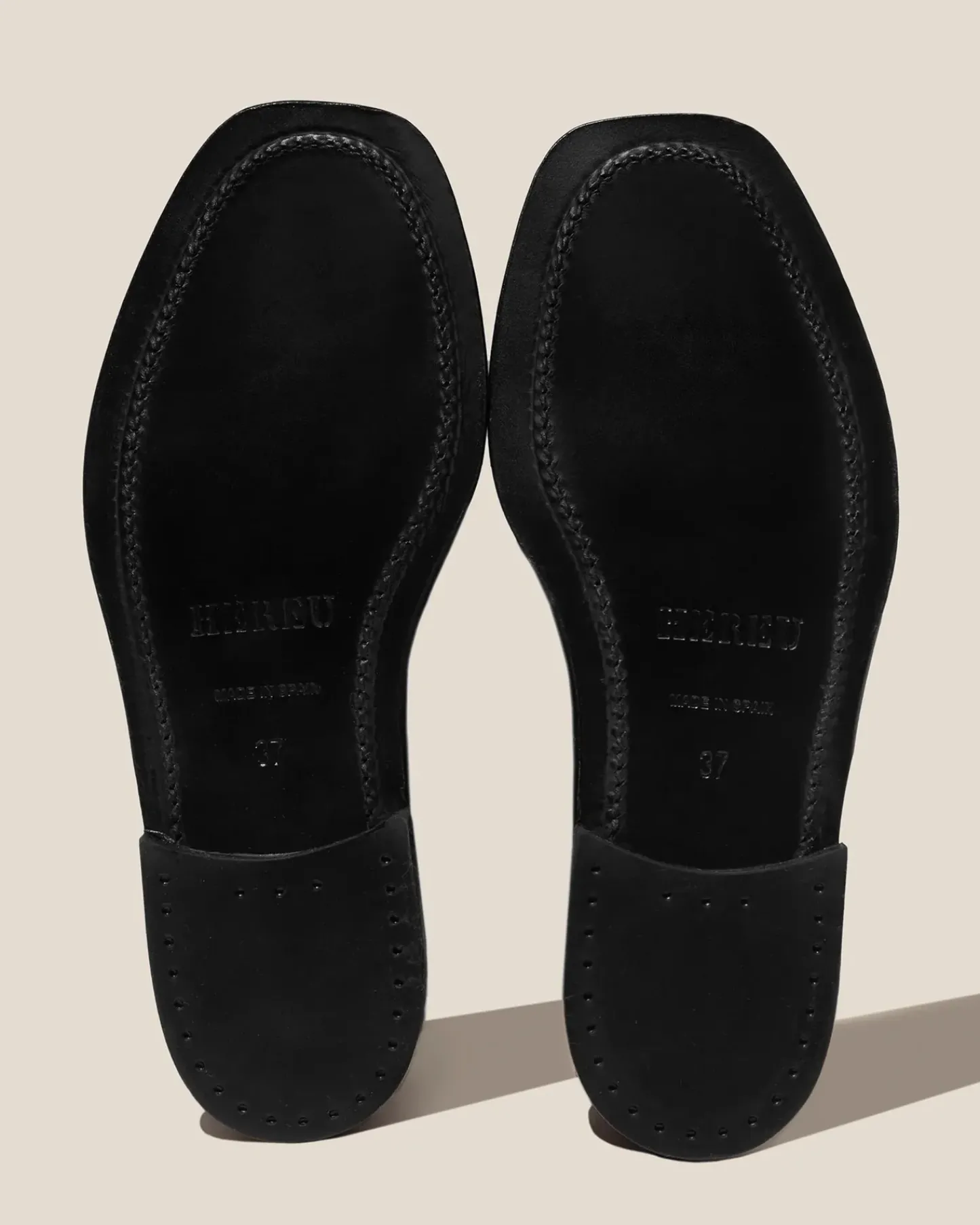 Lace-to-toe loafer crafted in glossy calf leather. The outsole is stitched to the upper for extra flexibility and durability.