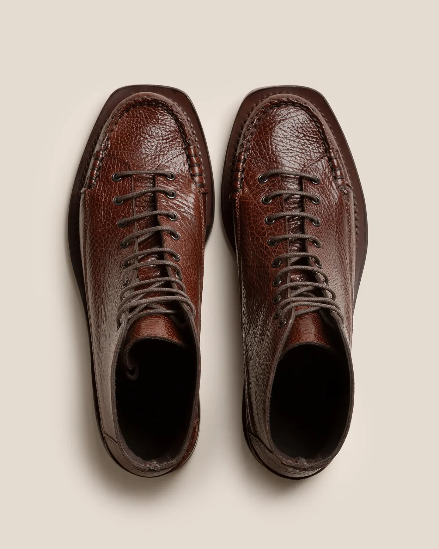 Lace-to-toe loafer crafted in glossy calf leather. The outsole is stitched to the upper for extra flexibility and durability.