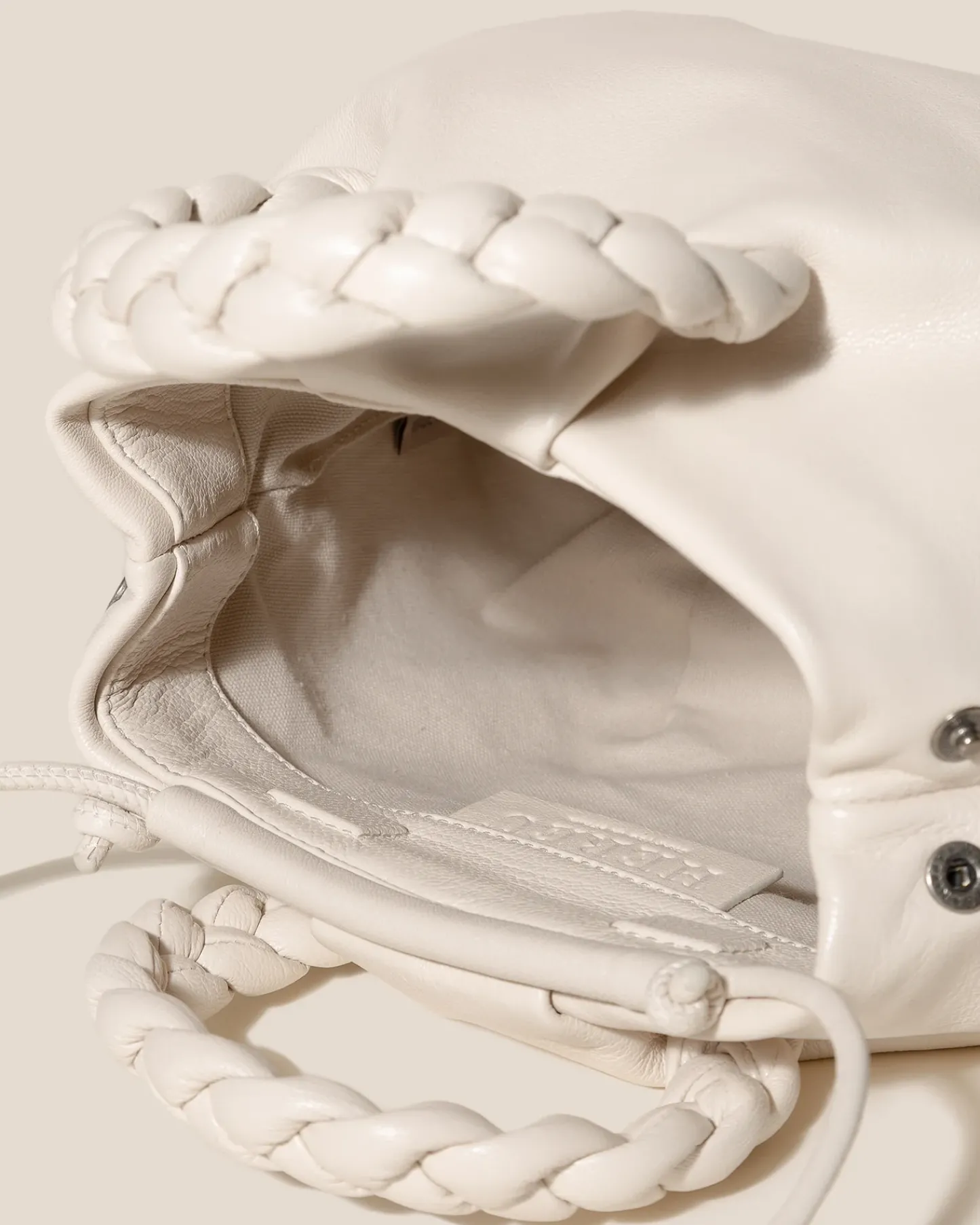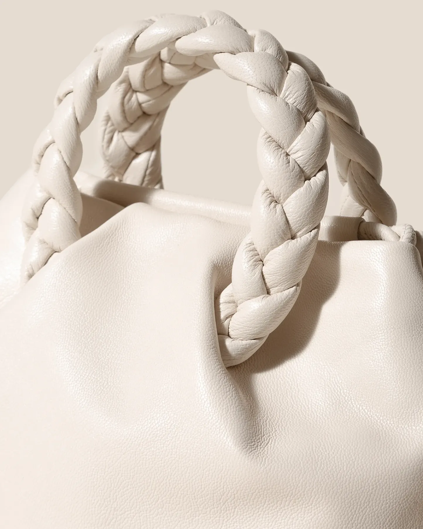Medium leather tote with braided leather handles, crafted in supple shiny lambskin lined with organic cotton canvas.