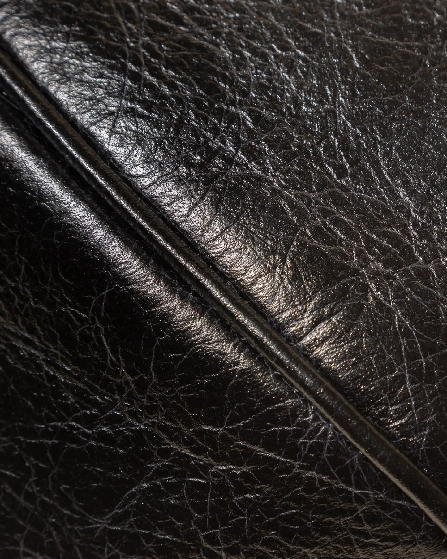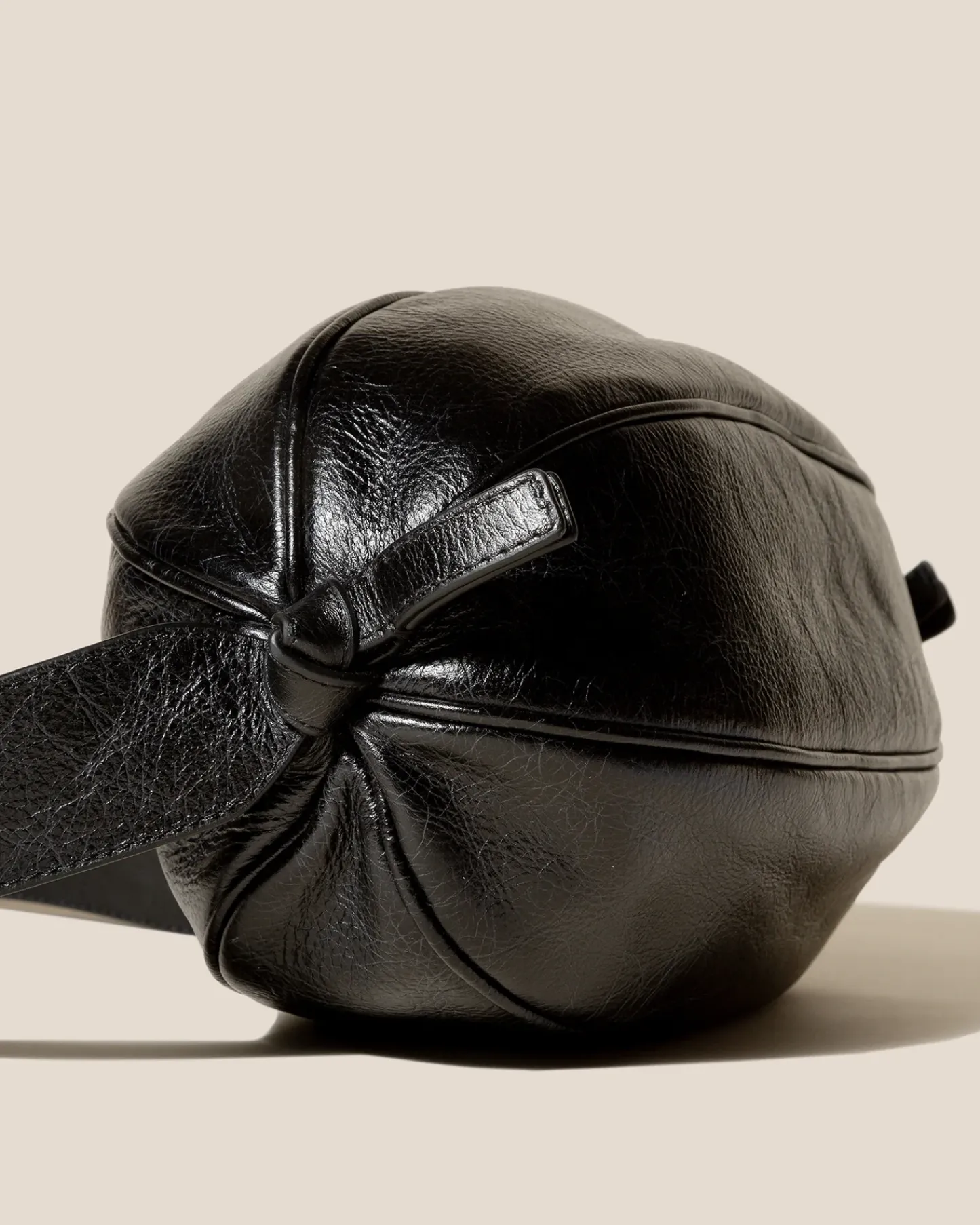Large elongated ball-shape crossbody bag with knotted side details. Crafted in distressed calf leather and lined with organic cotton canvas.