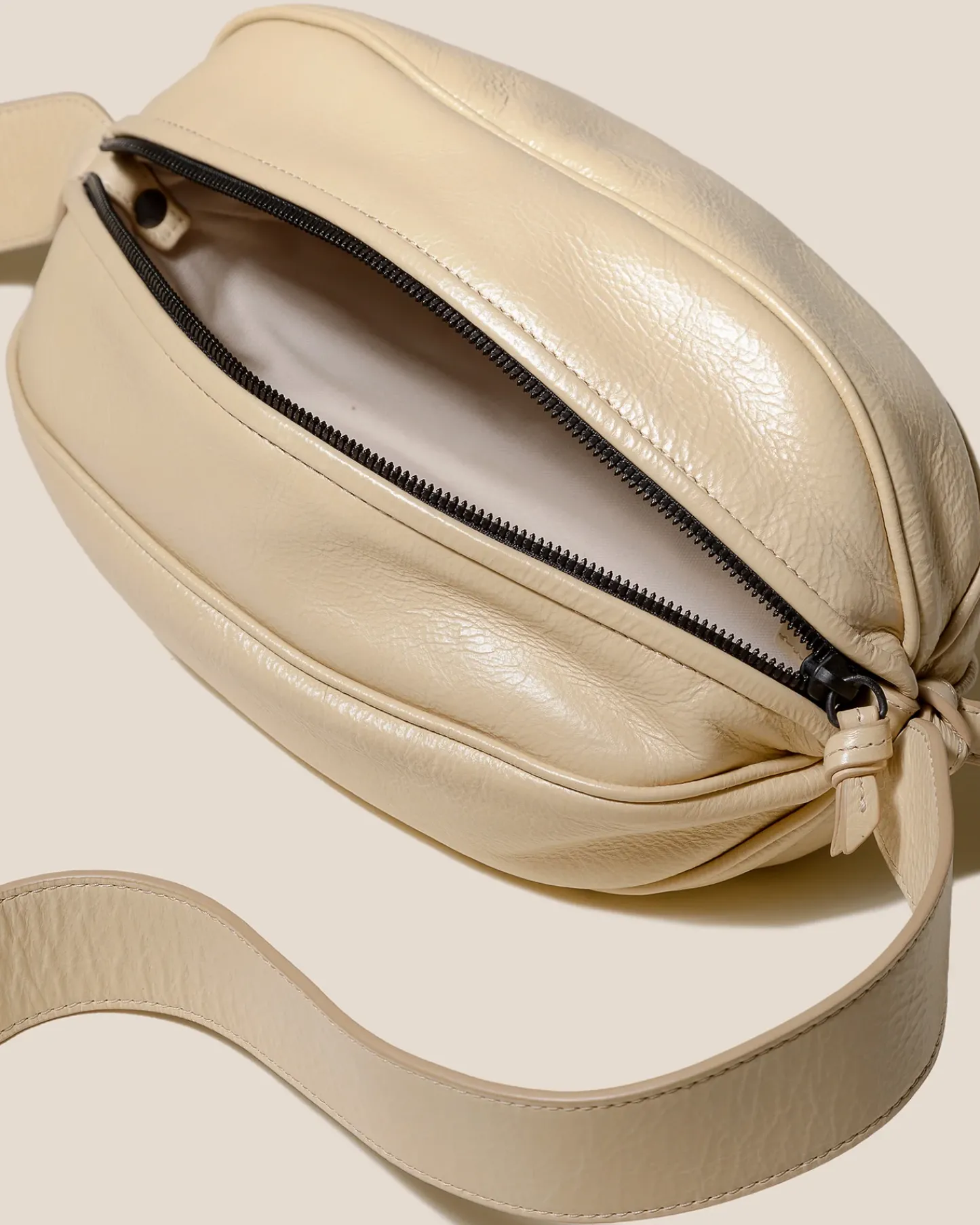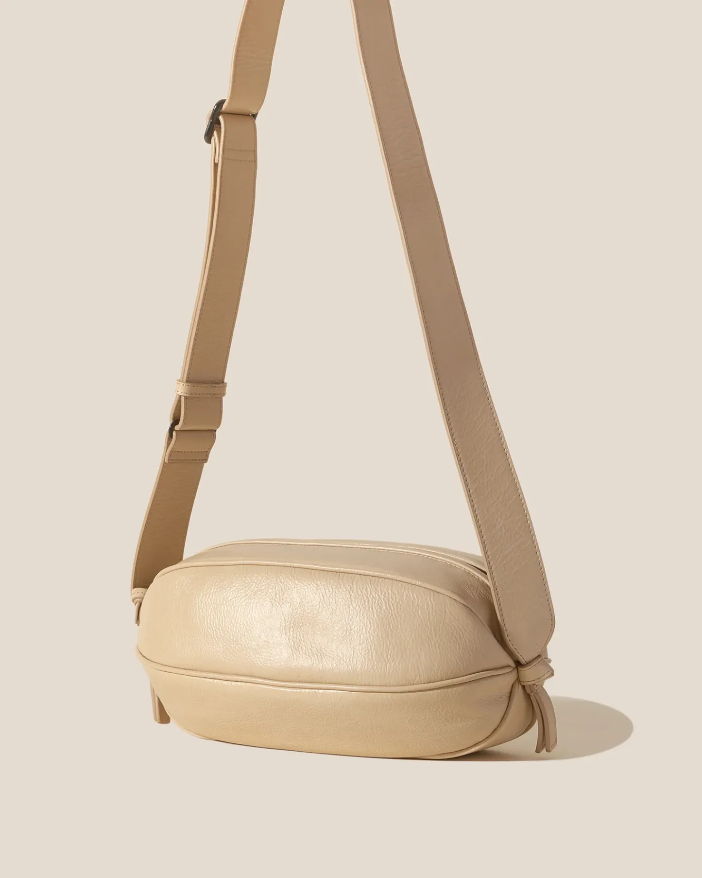 Large elongated ball-shape crossbody bag with knotted side details. Crafted in distressed calf leather and lined with organic cotton canvas.