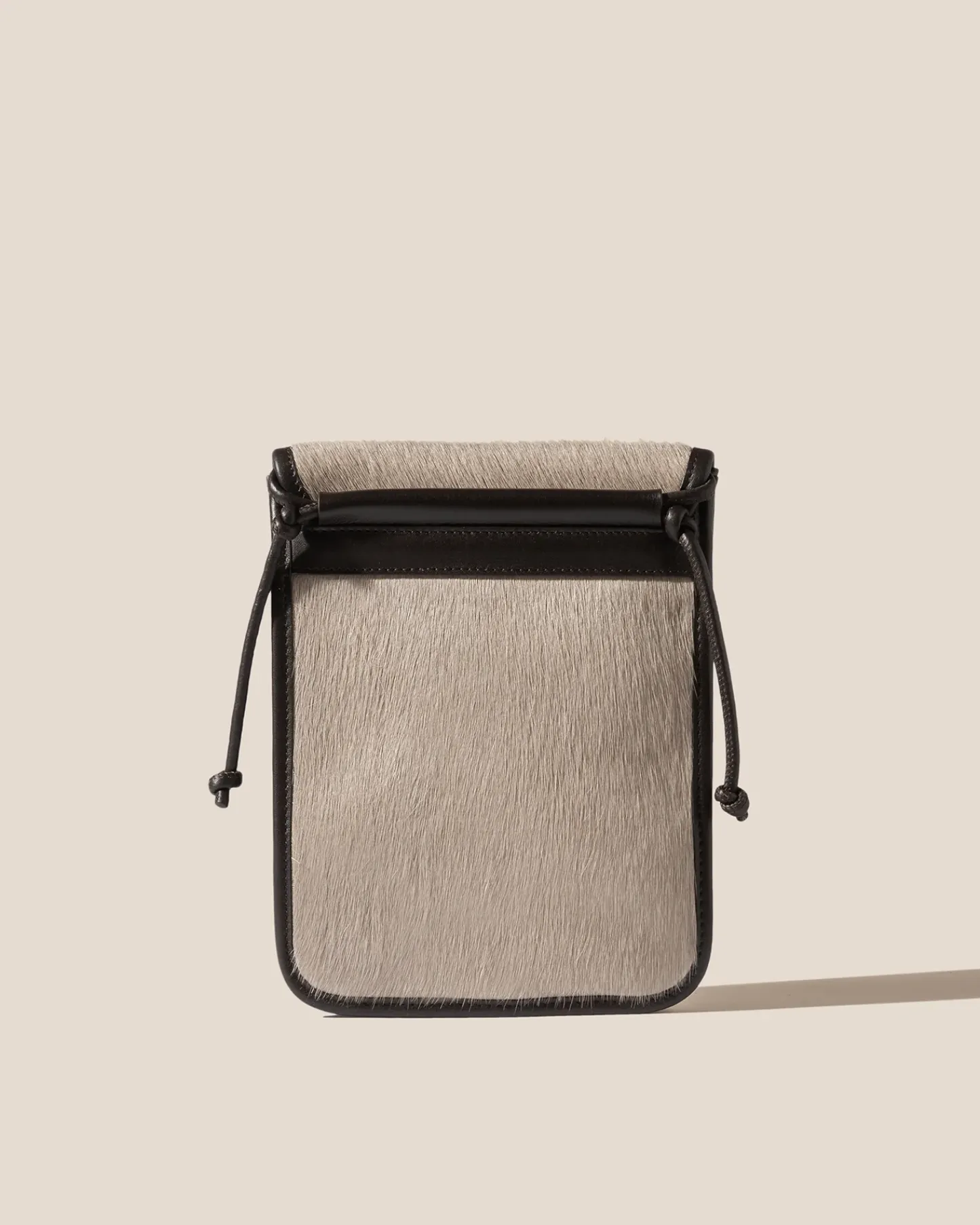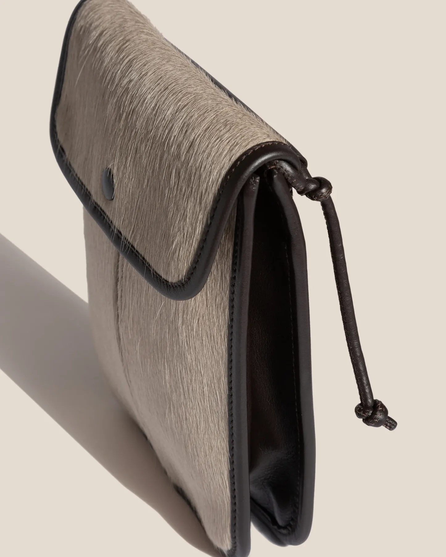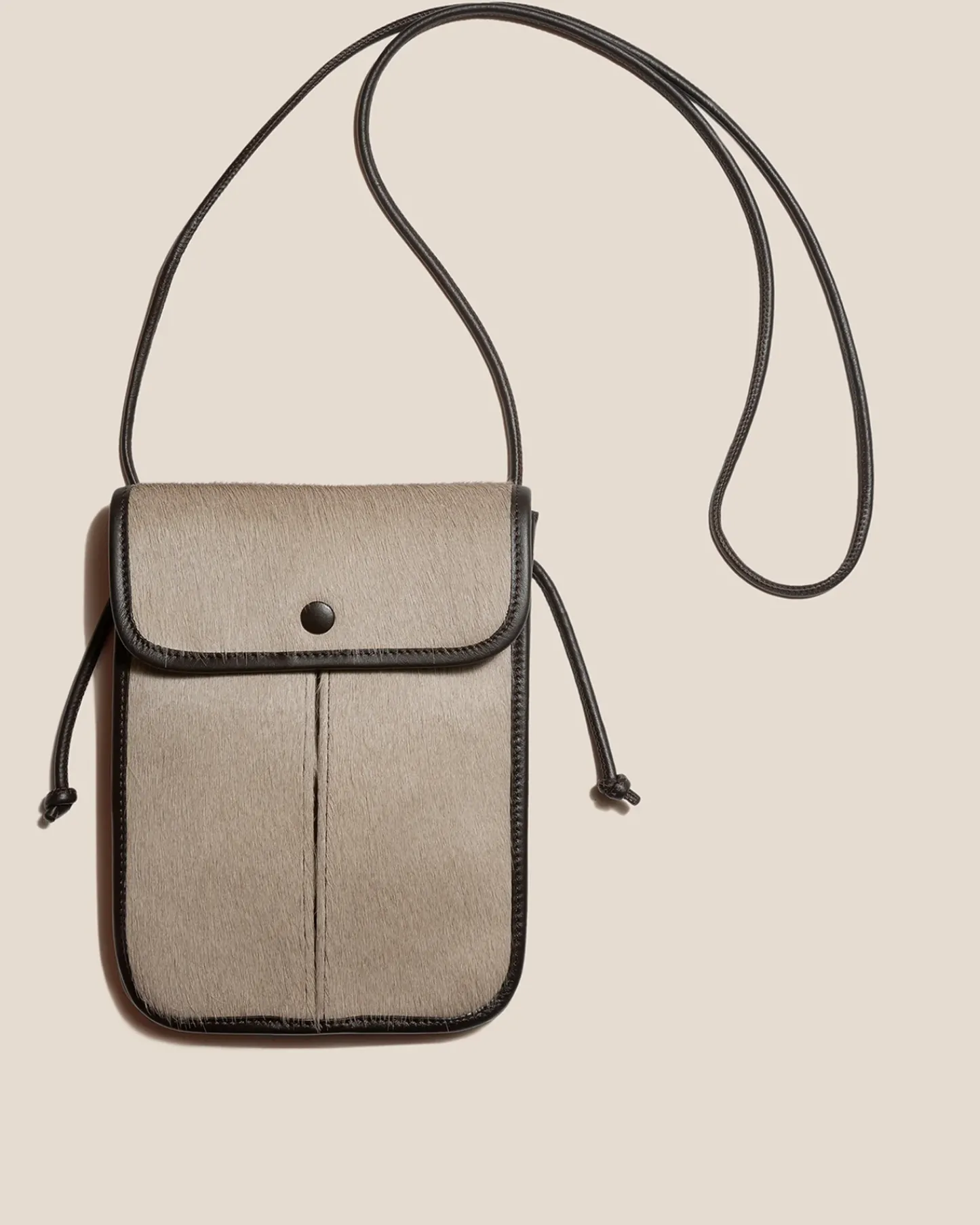 Square flat crossbody crafted in European calf hair and trimmed with calf leather. Organic cotton lining.