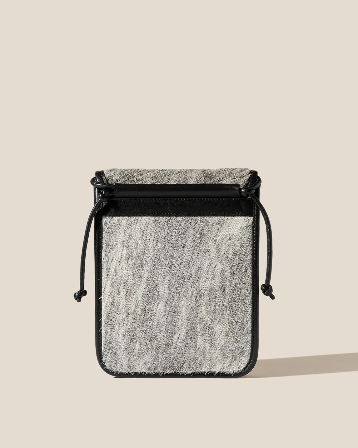 Square flat crossbody crafted in European calf hair and trimmed with calf leather. Organic cotton lining.