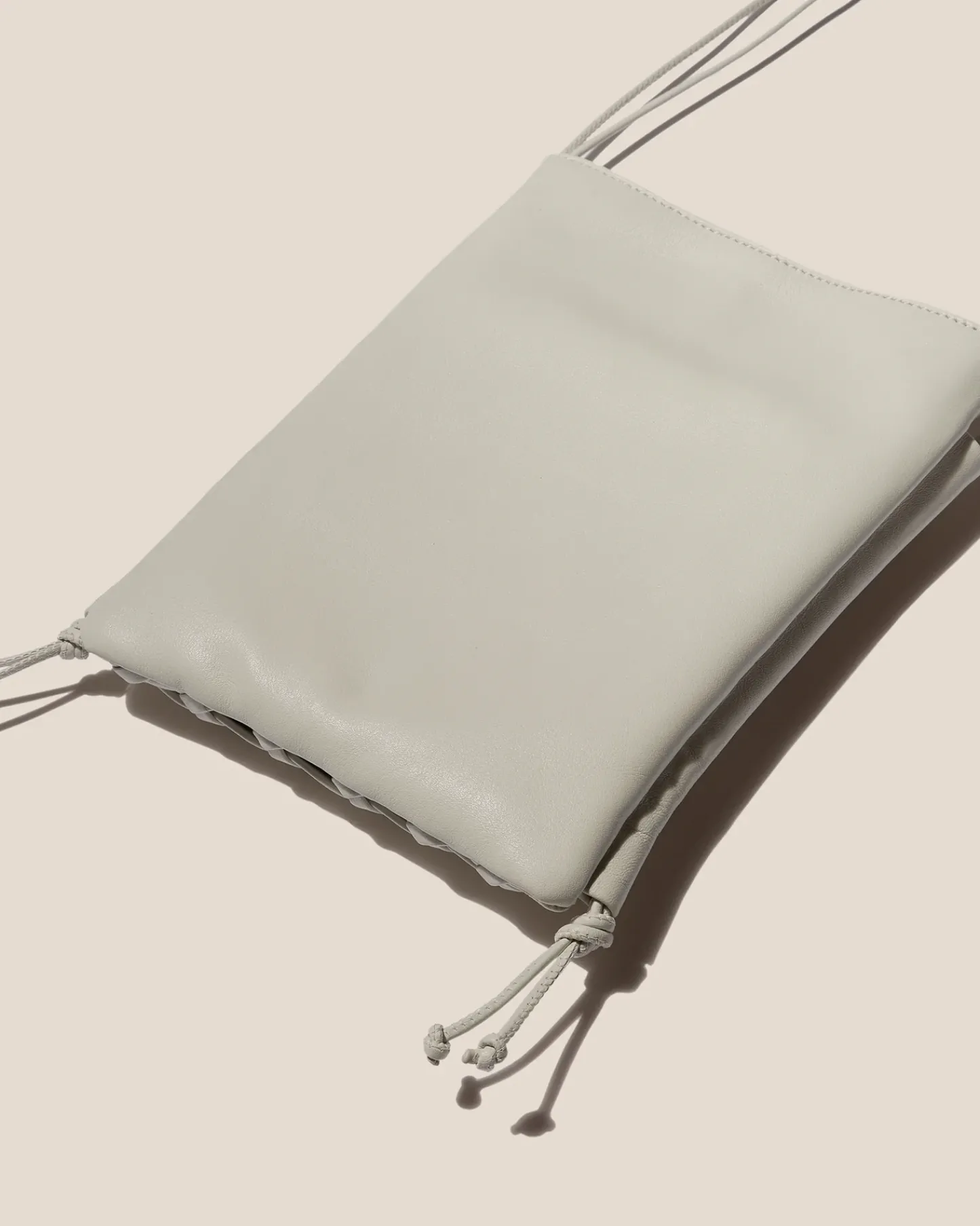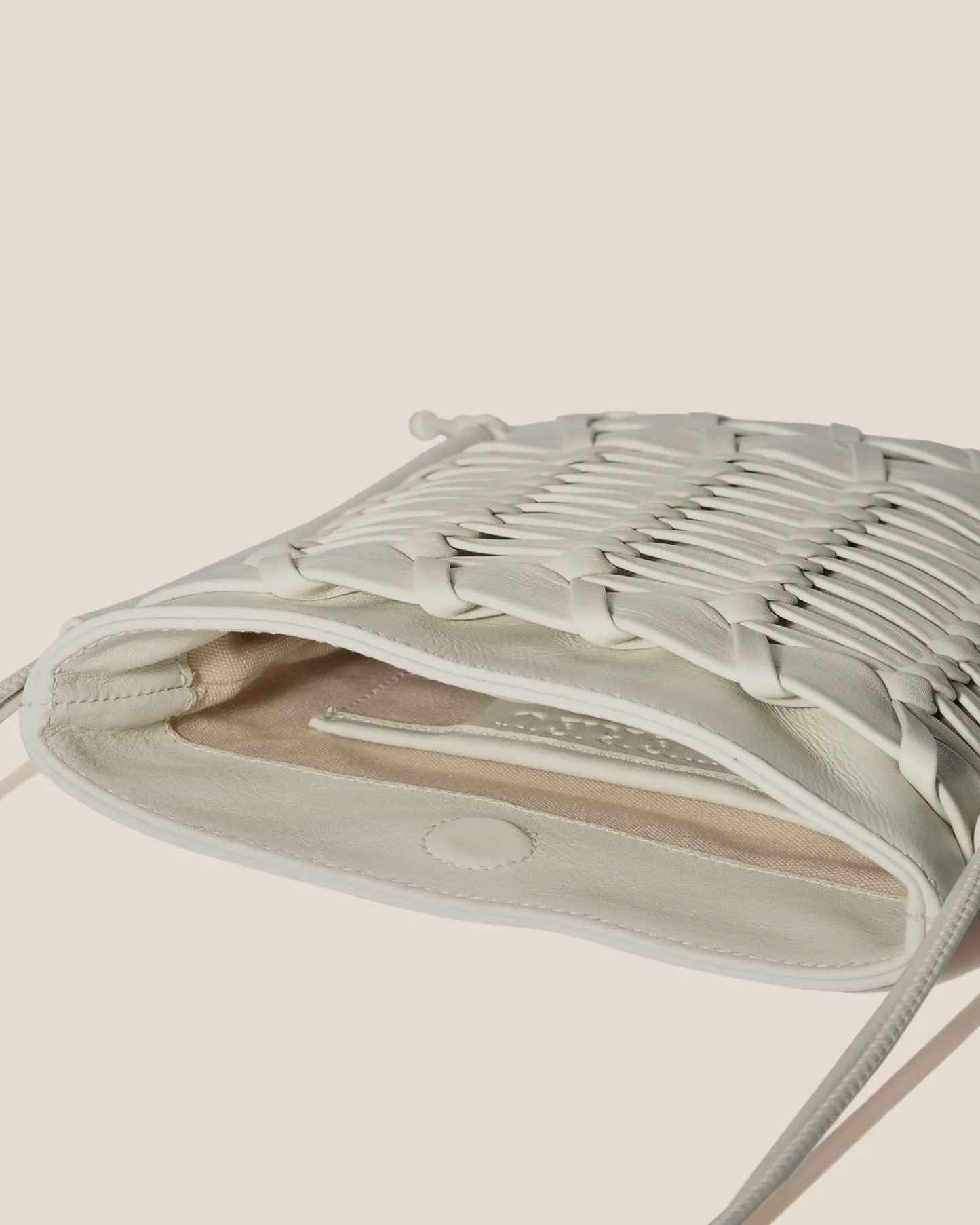 Flat square crossbody bag crafted in soft calf leather, with a handwoven front pocket.