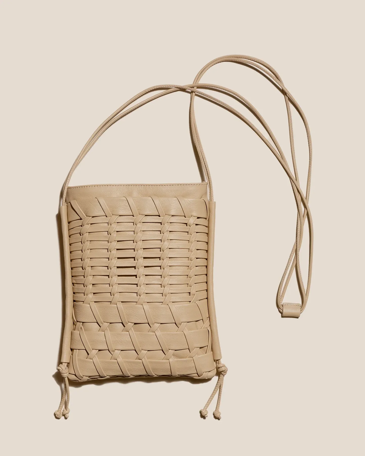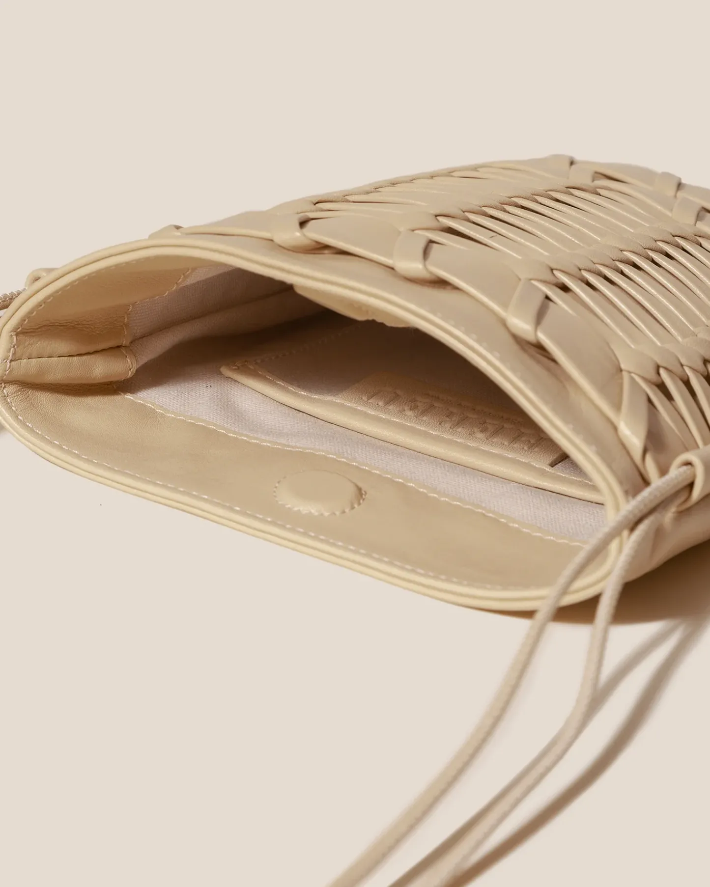 Flat square crossbody bag crafted in soft calf leather, with a handwoven front pocket.