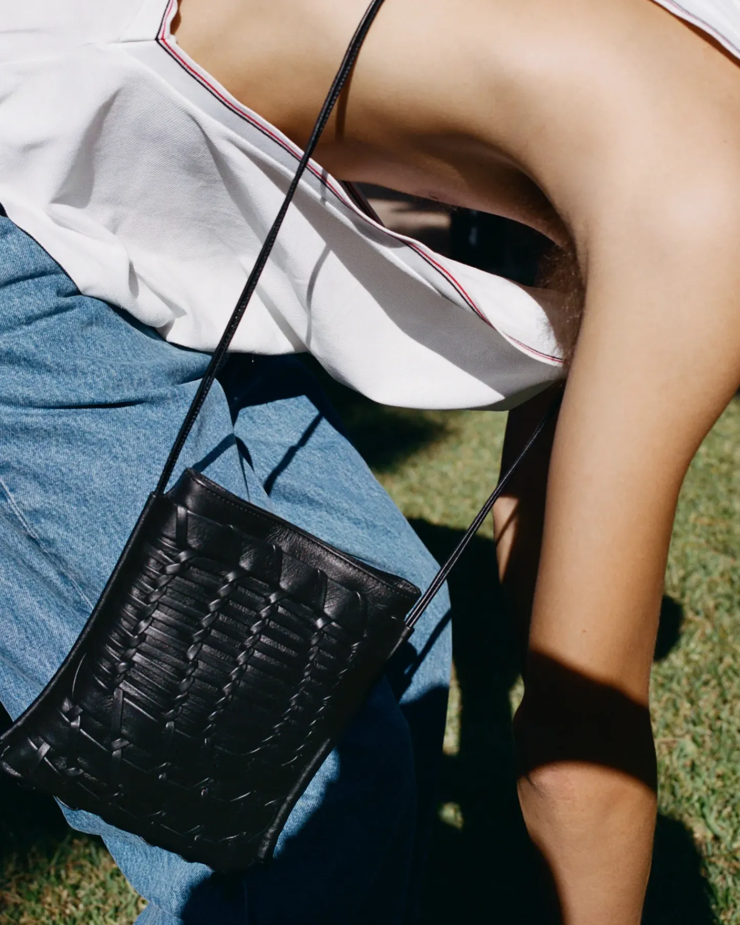 Flat square crossbody bag crafted in soft calf leather, with a handwoven front pocket.