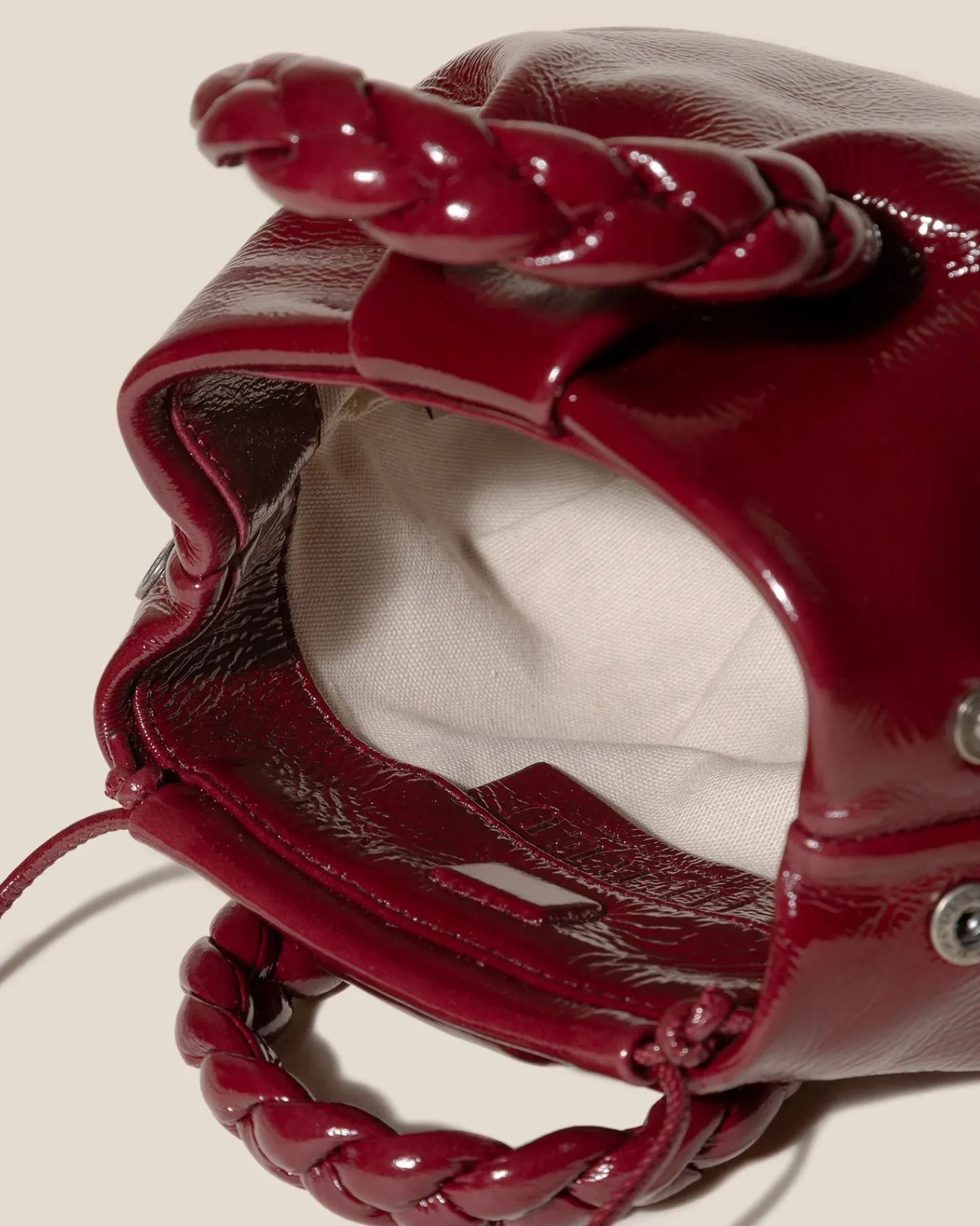 Small leather tote with braided leather handles, crafted in Italian glossy tumbled lambskin lined with organic cotton canvas.