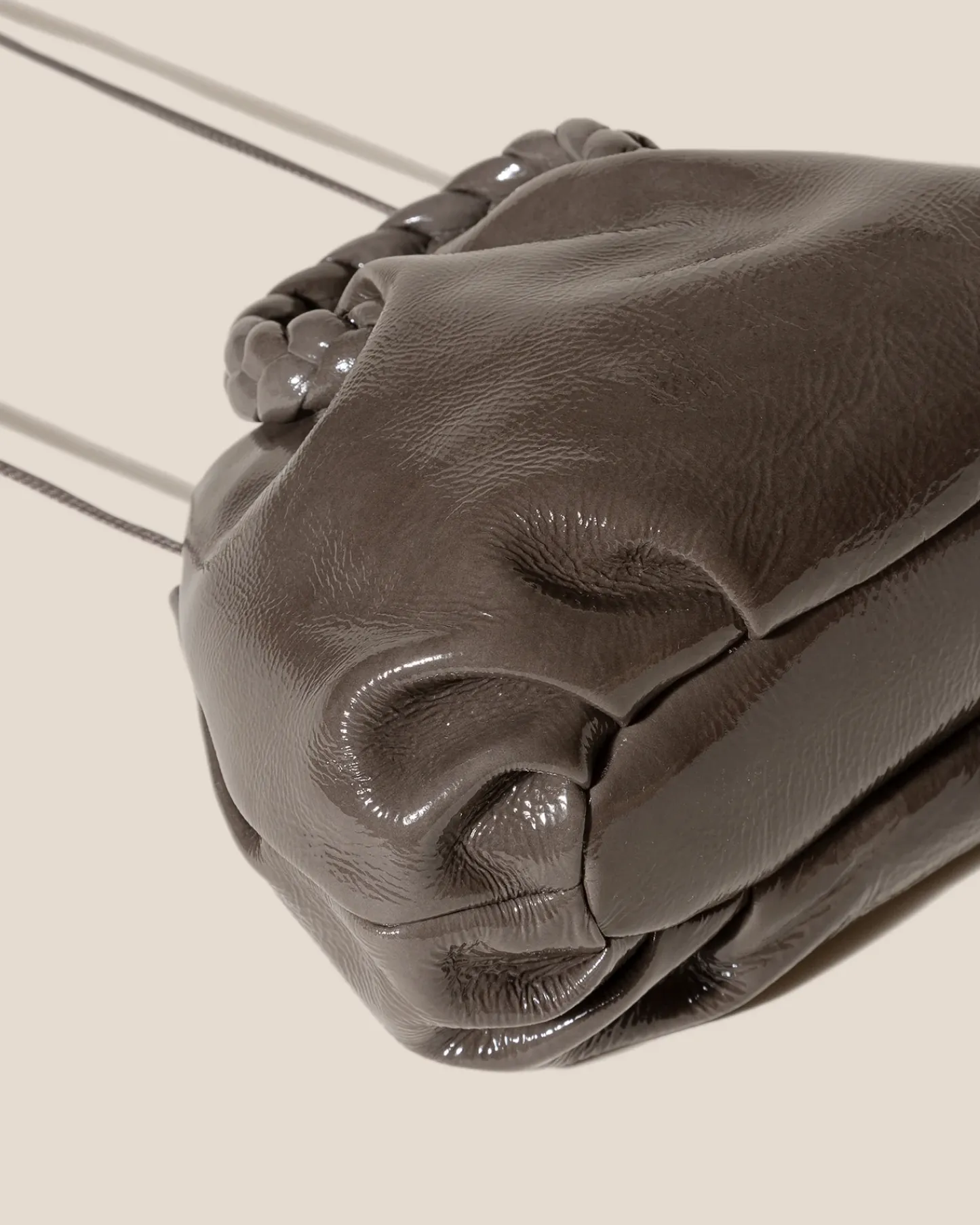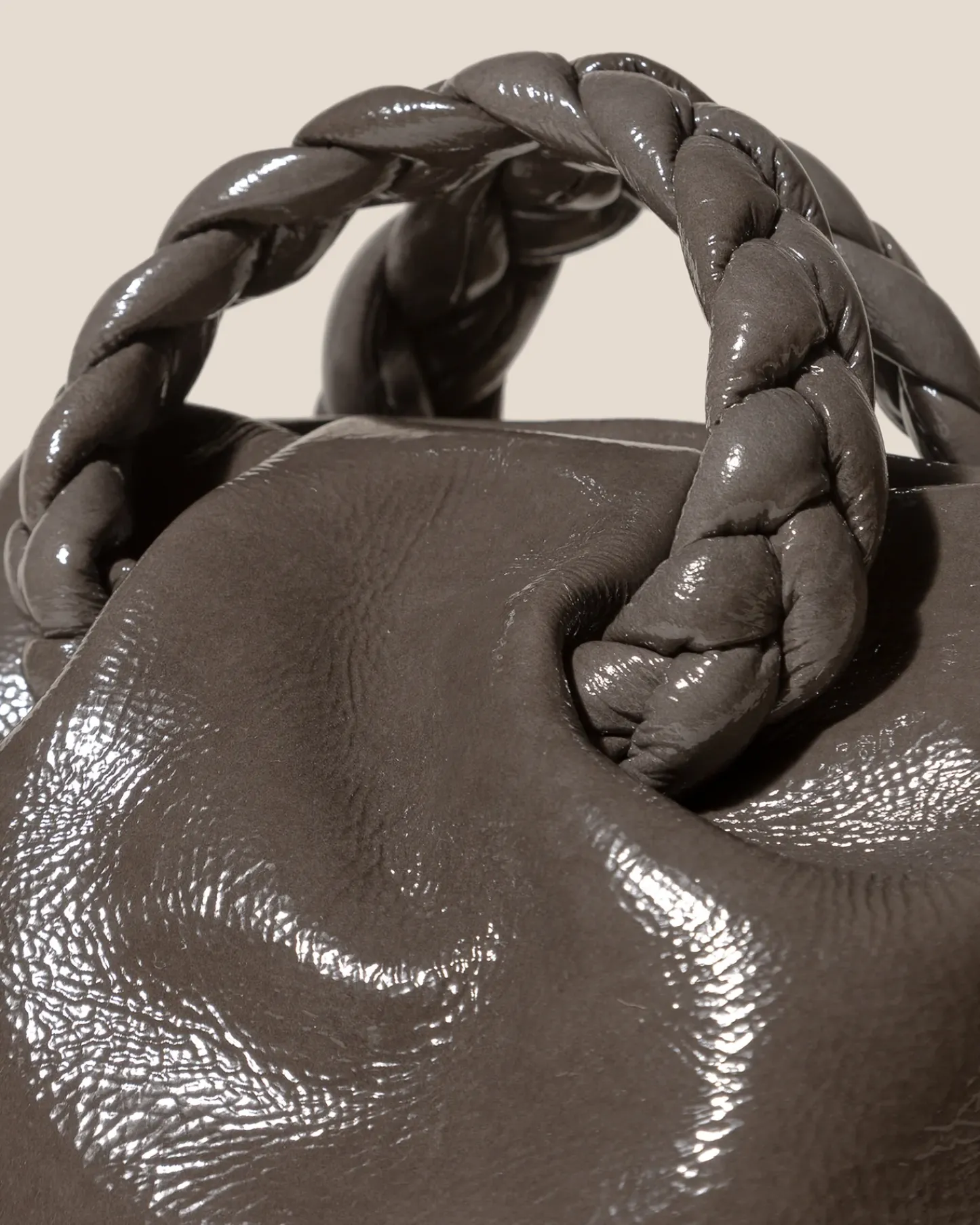 Small leather tote with braided leather handles, crafted in Italian glossy tumbled lambskin lined with organic cotton canvas.