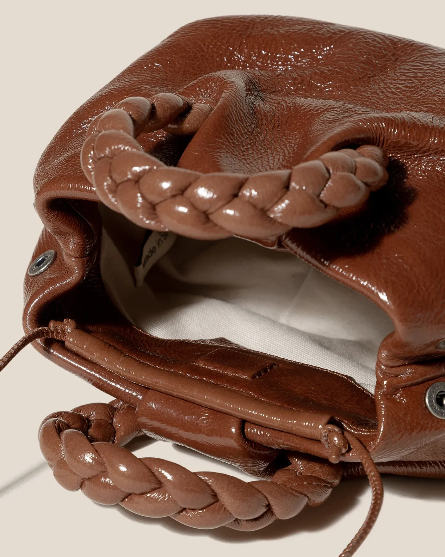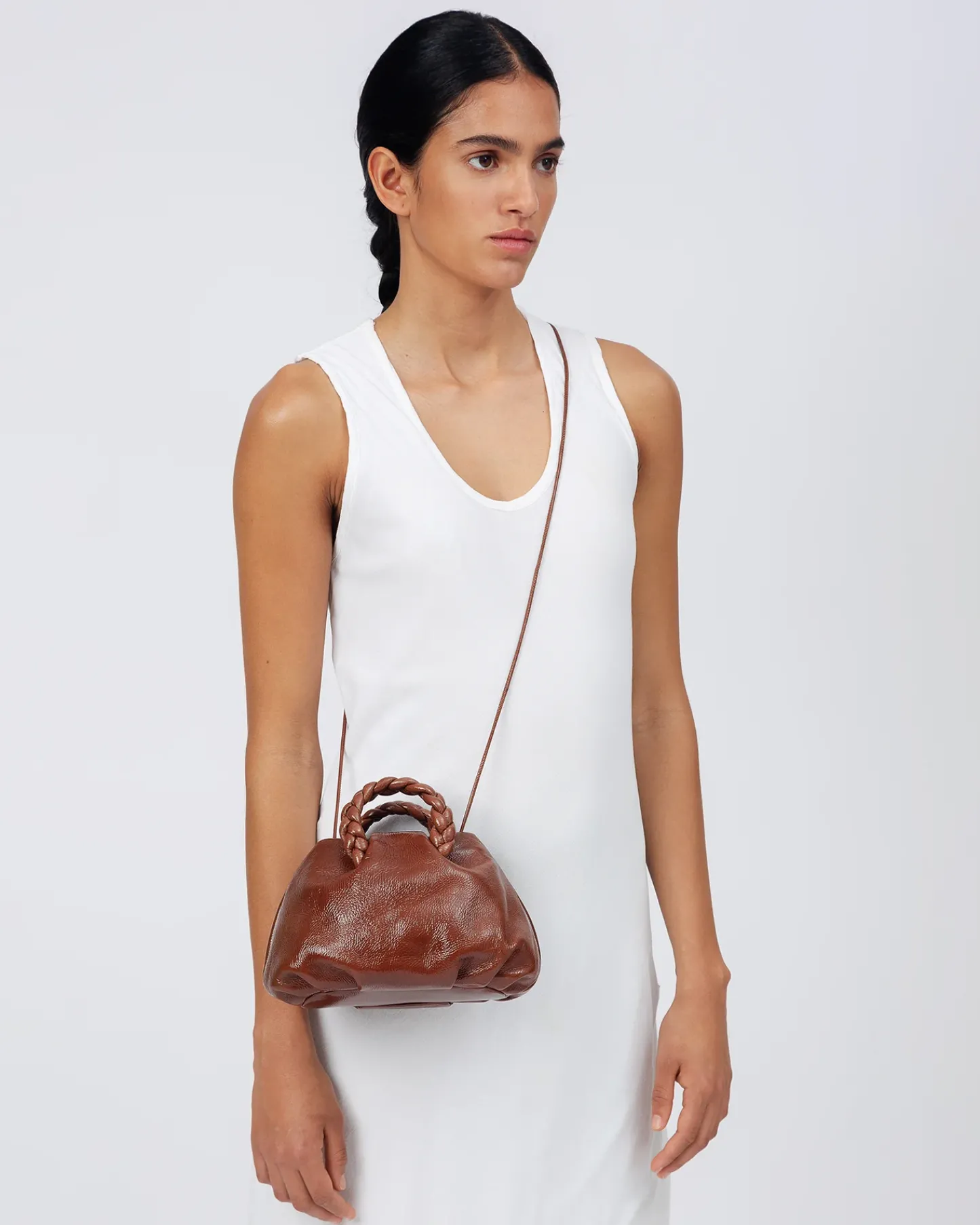Small leather tote with braided leather handles, crafted in Italian glossy tumbled lambskin lined with organic cotton canvas.