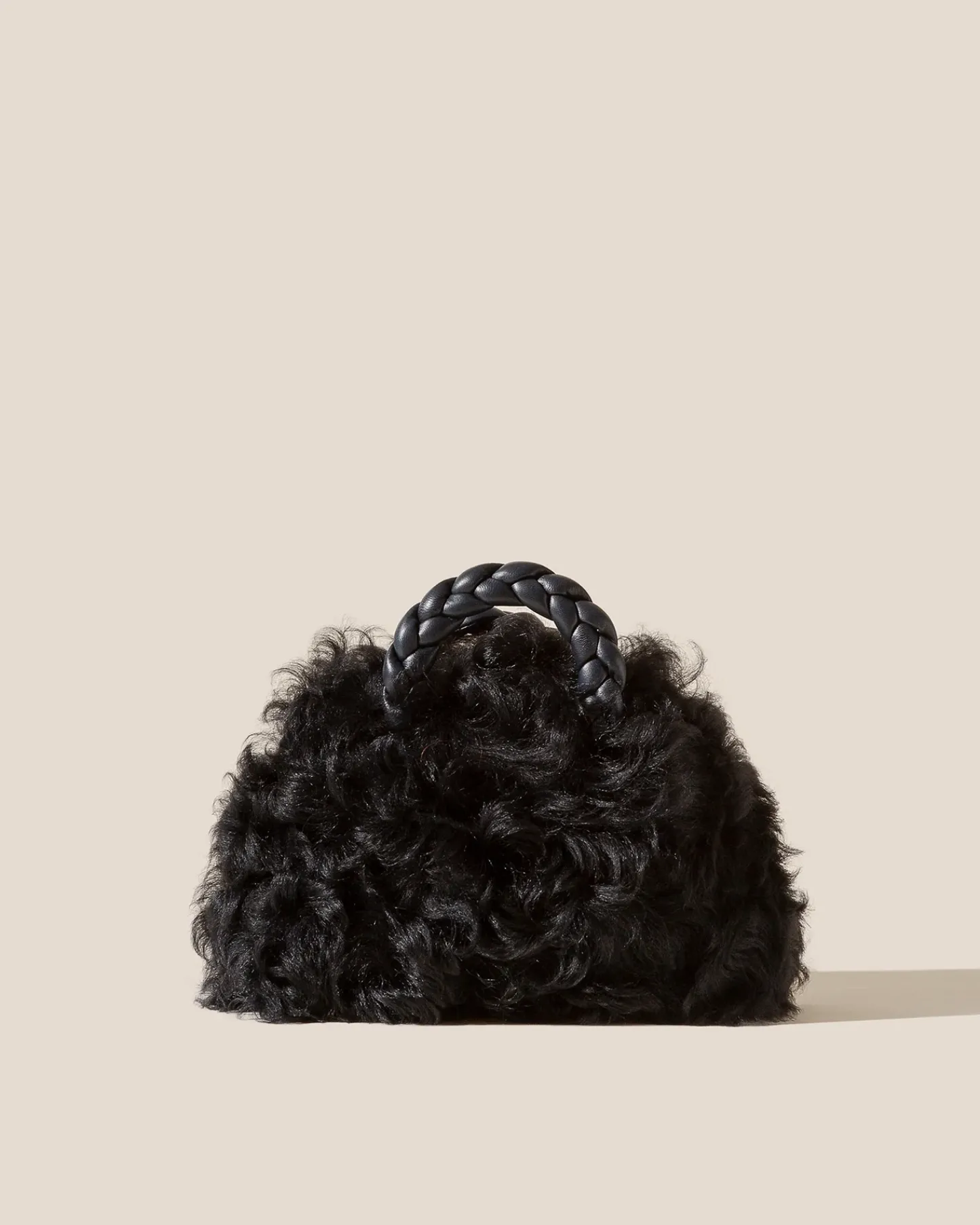 Small crossbody bag with braided leather handles, crafted in long hair shearling sheepskin and supple lambskin.