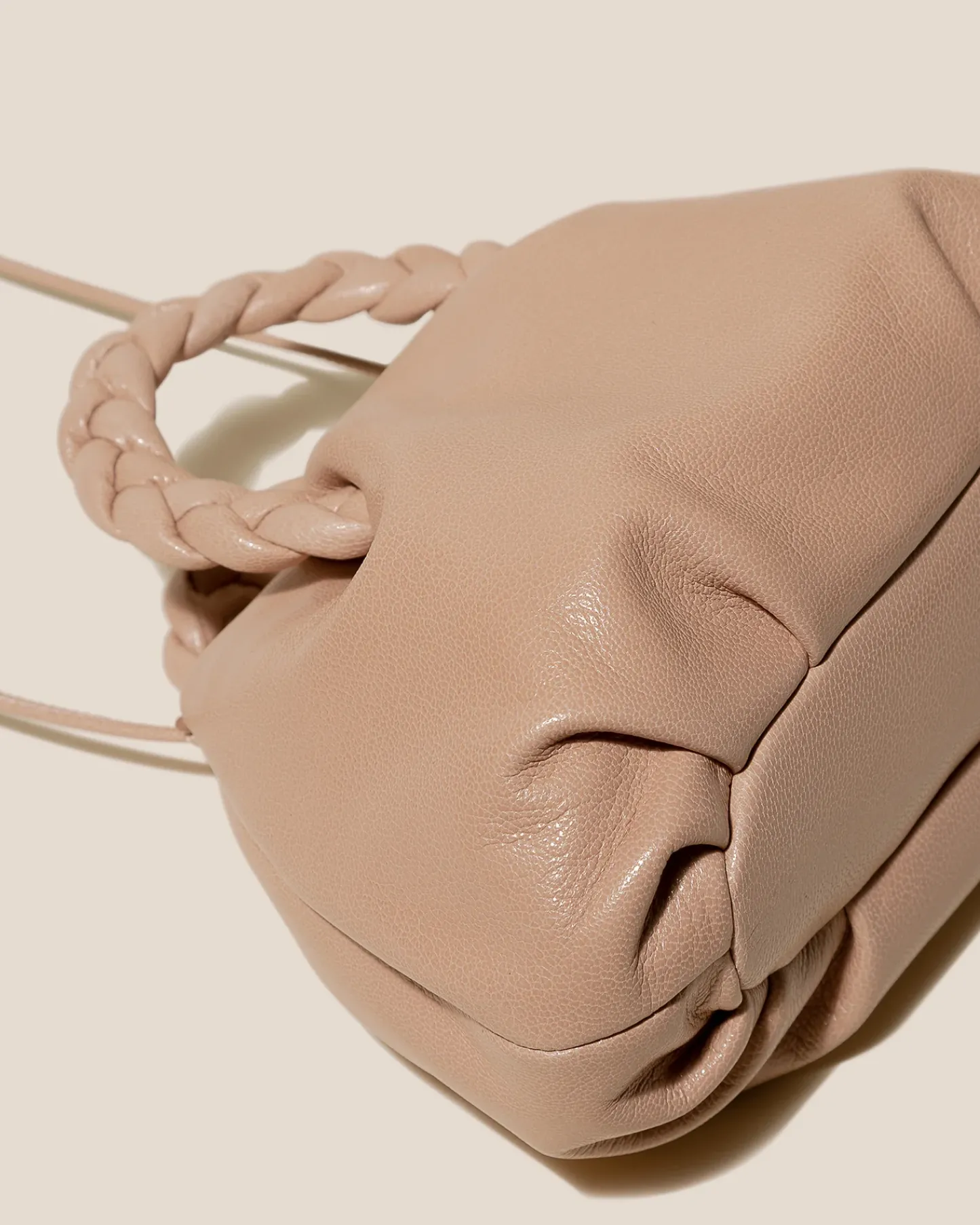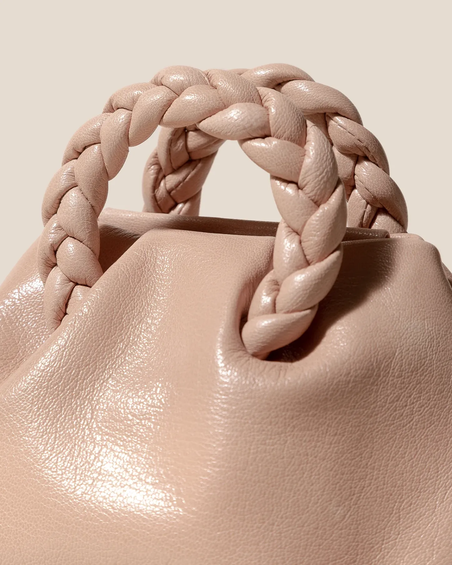 Small leather tote with braided leather handles, crafted in supple shiny lambskin.