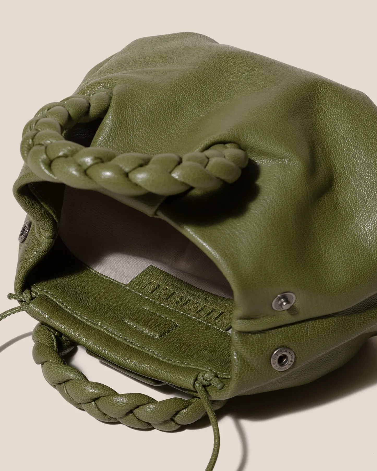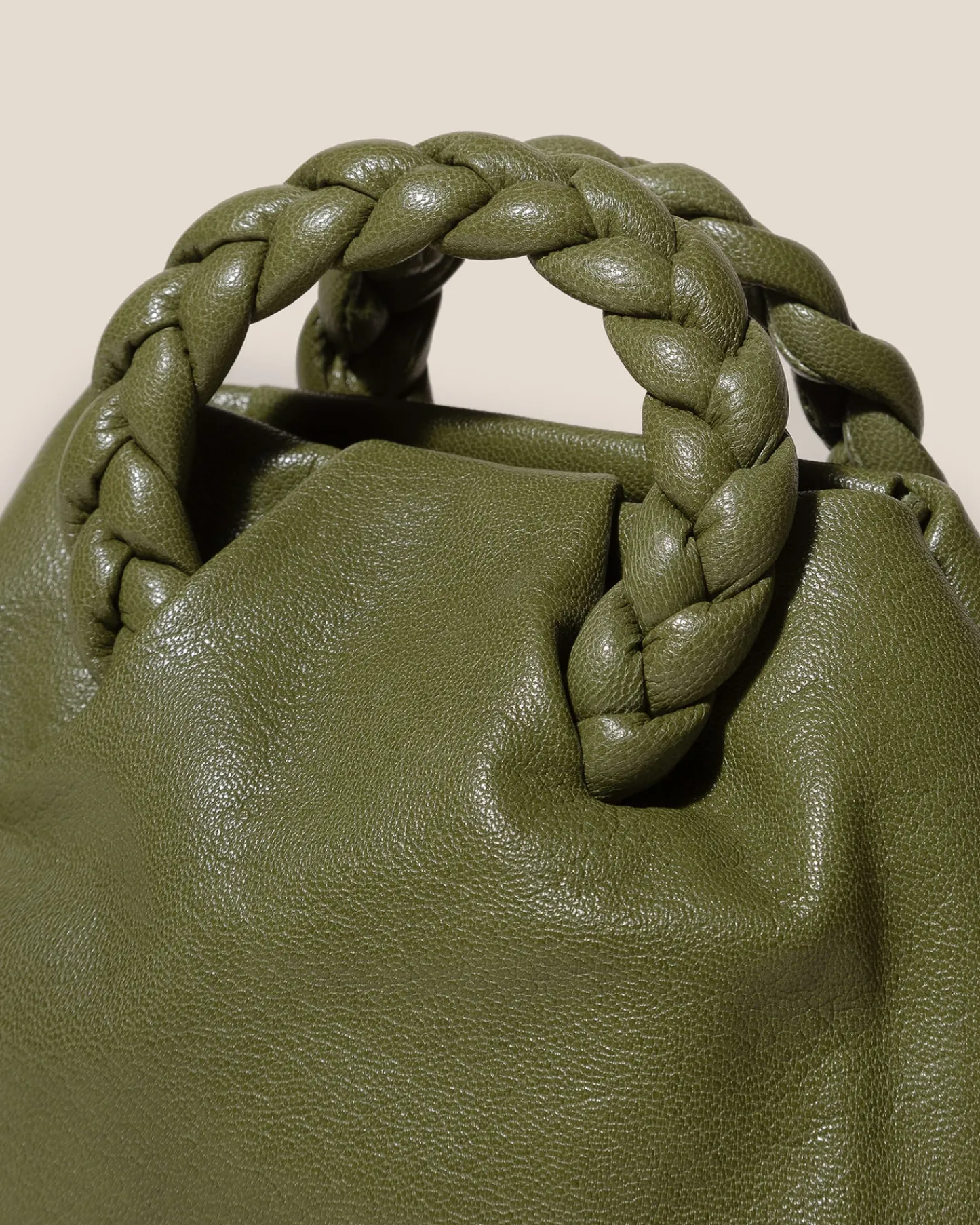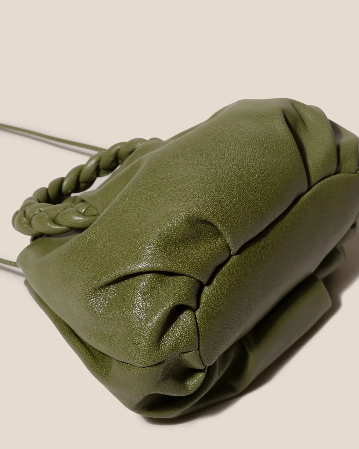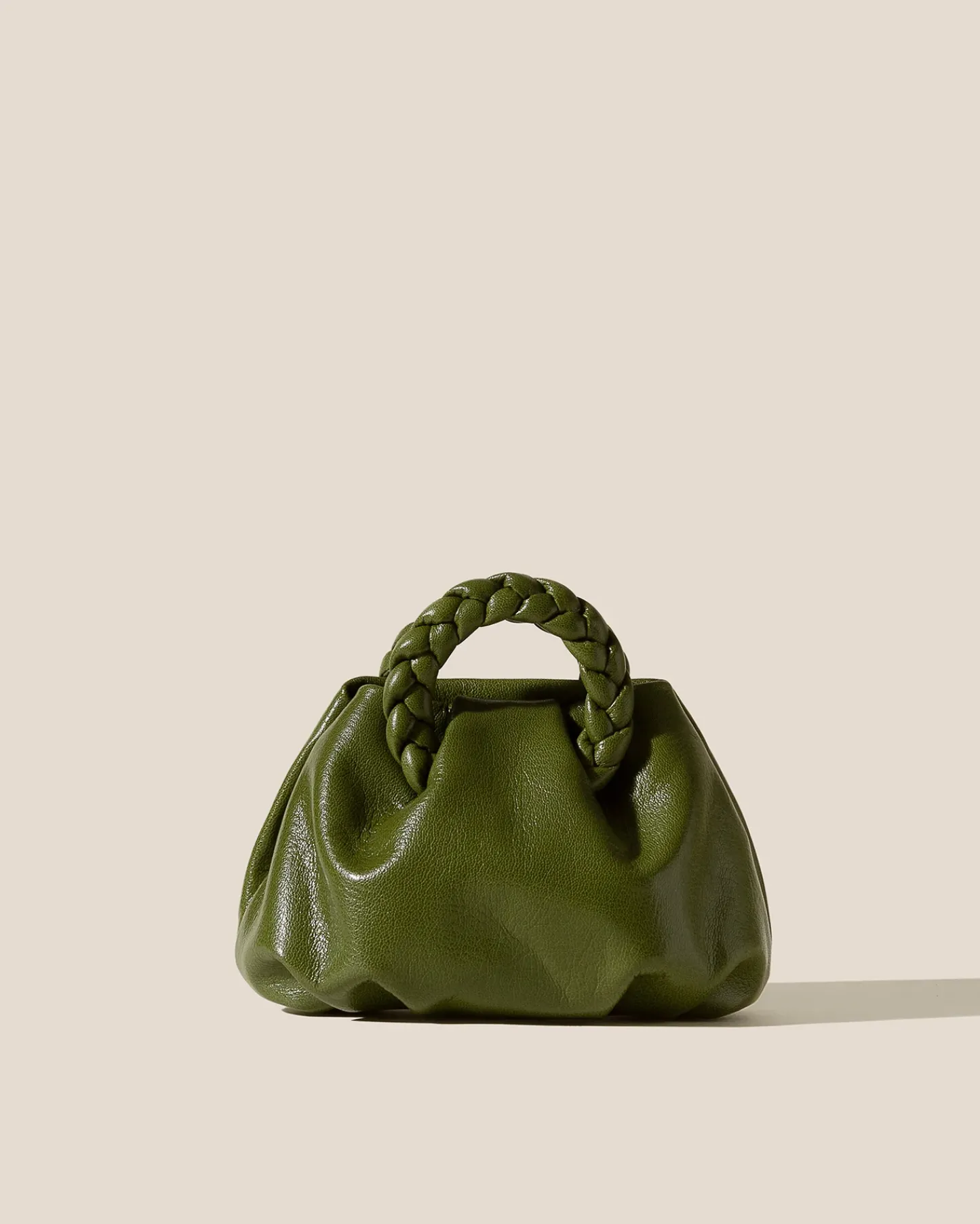 Small leather tote with braided leather handles, crafted in supple shiny lambskin.