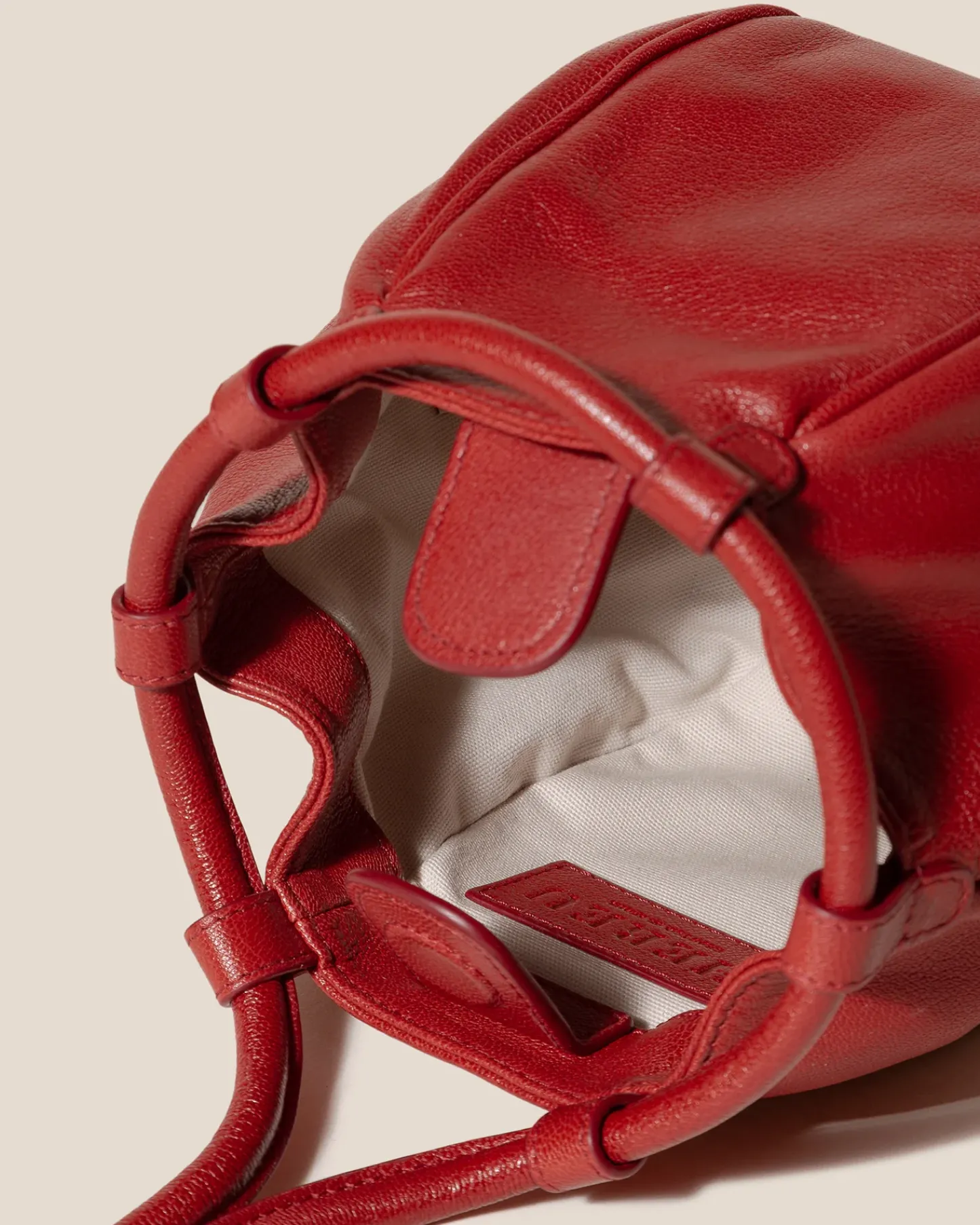 Balloon-shaped drawstring shoulder/tote bag crafted in supple shiny lambskin and lined with organic cotton canvas.