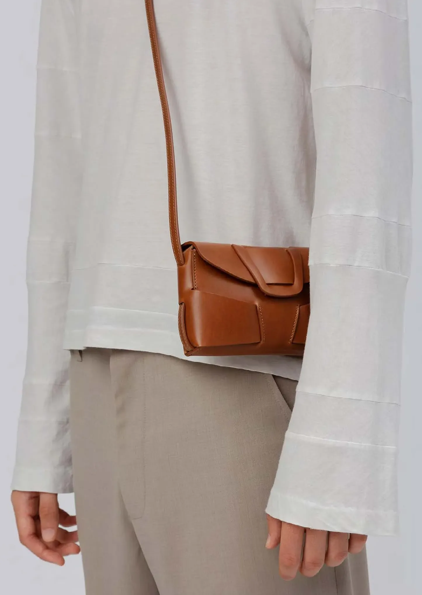 Mini crossbody bag with woven detail in Spanish structured calf leather and lined in calf suede.