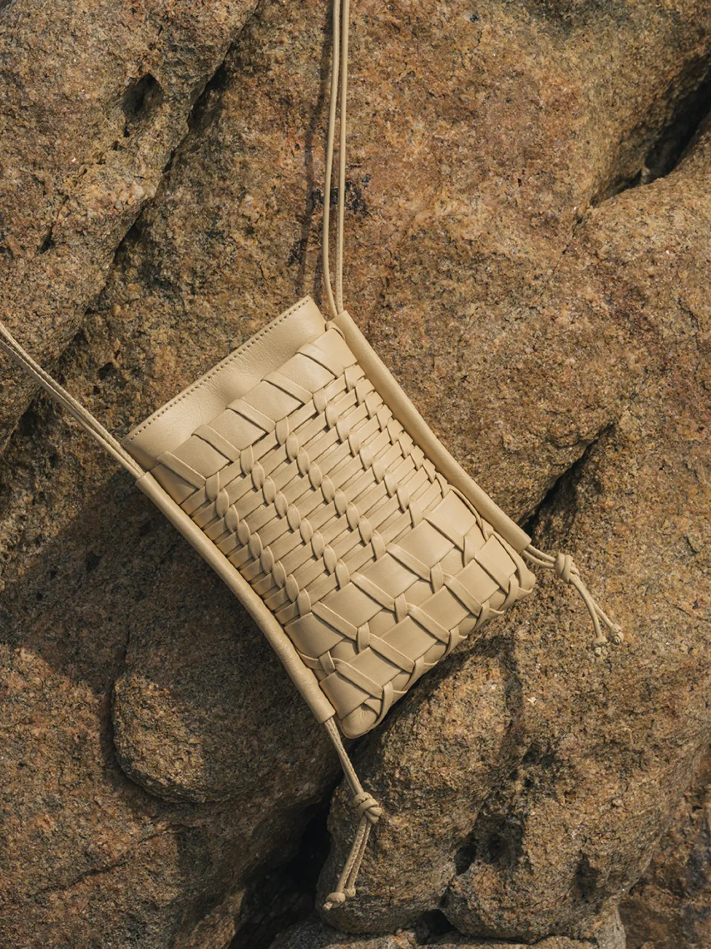 Mini flat square crossbody bag crafted in soft calf leather, with a handwoven front pocket.