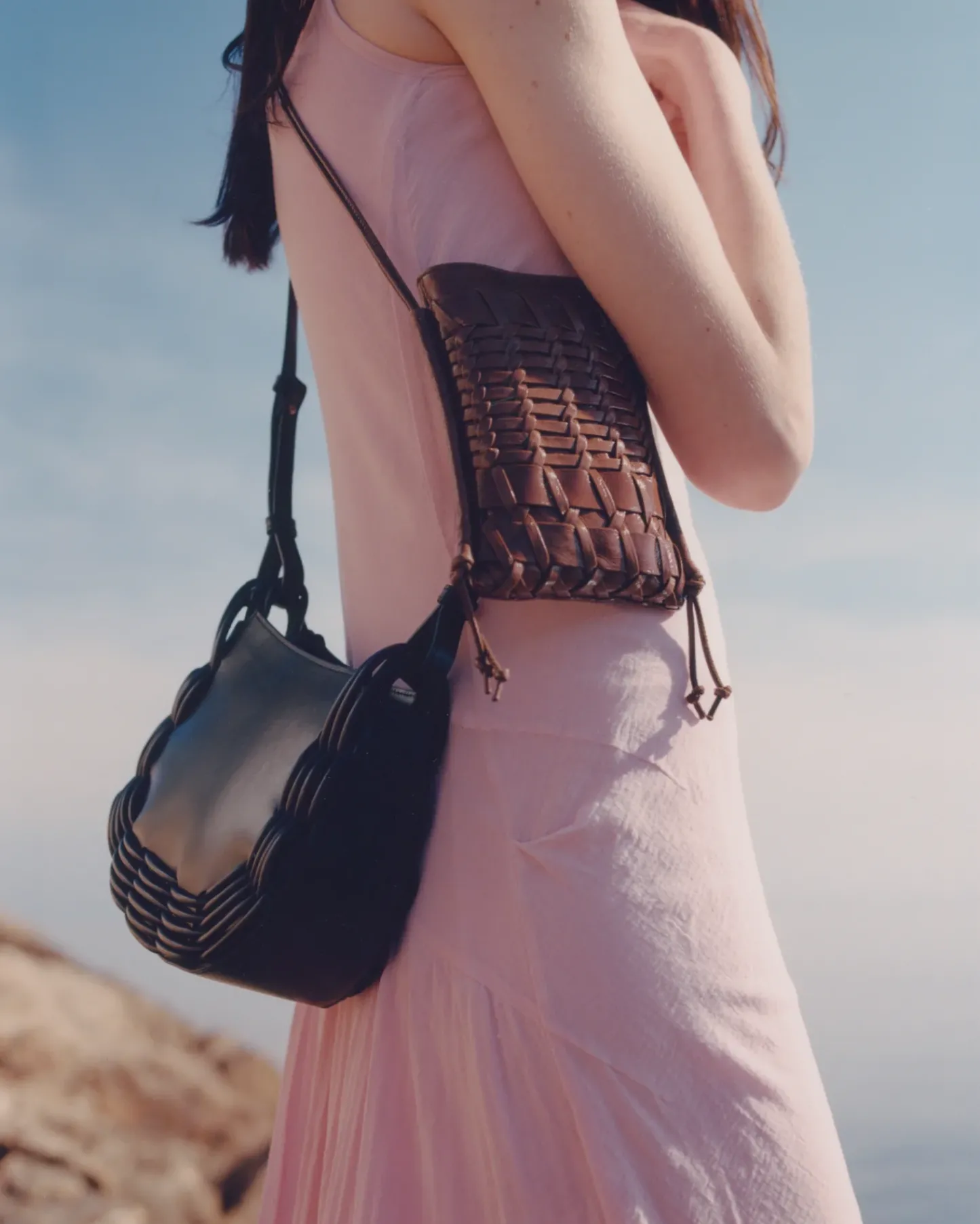 Mini flat square crossbody bag crafted in crinkled glossy lambskin, with a handwoven front pocket.