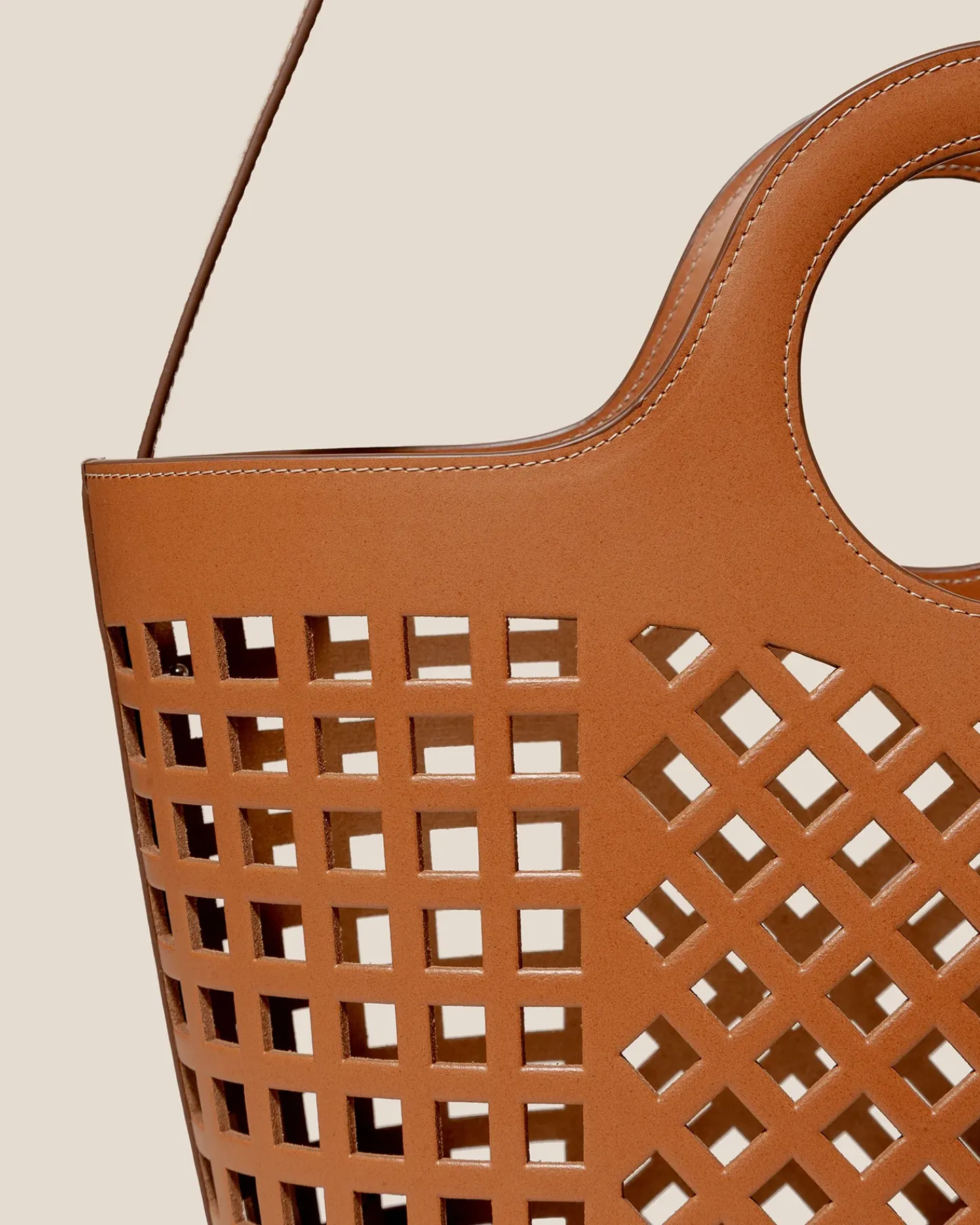 Cut-out leather tote crafted in smooth calf leather. A basket silhouette with circular cut-out handles.