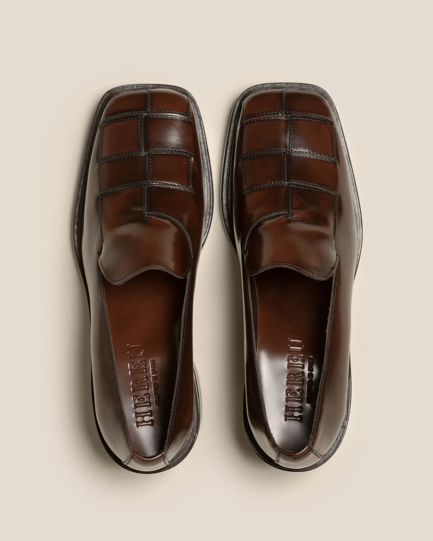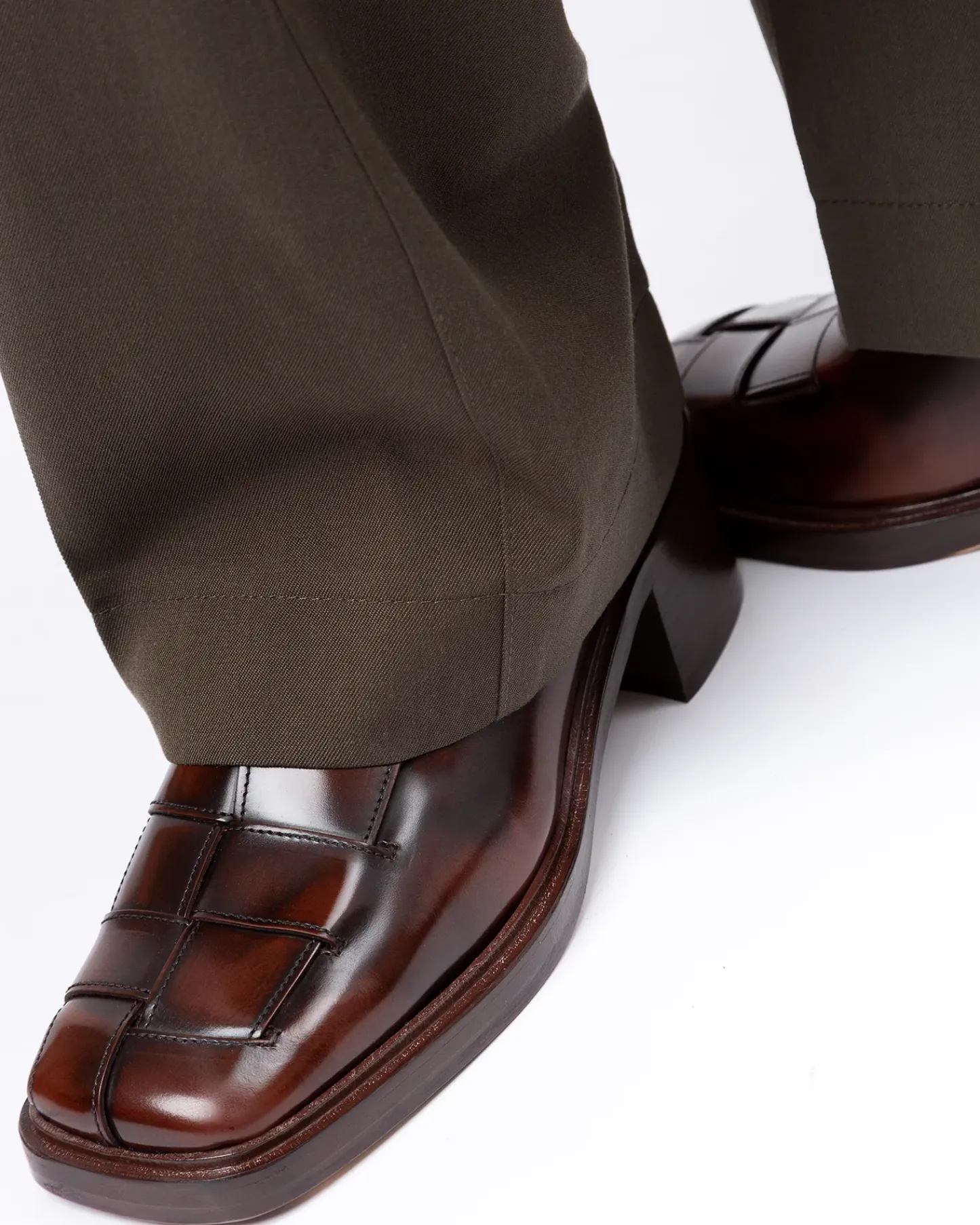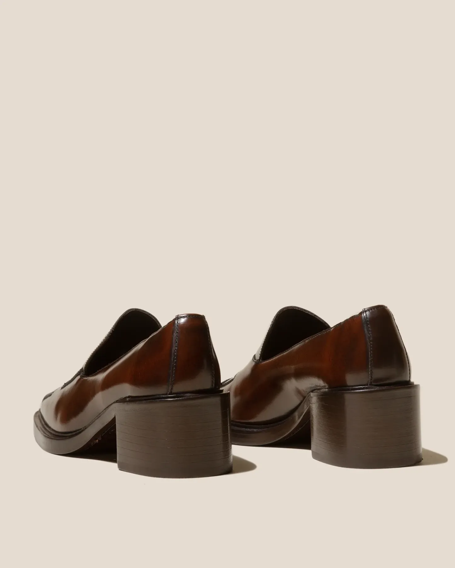 Interwoven heeled slip-on loafer crafted in Spanish brushed leather.