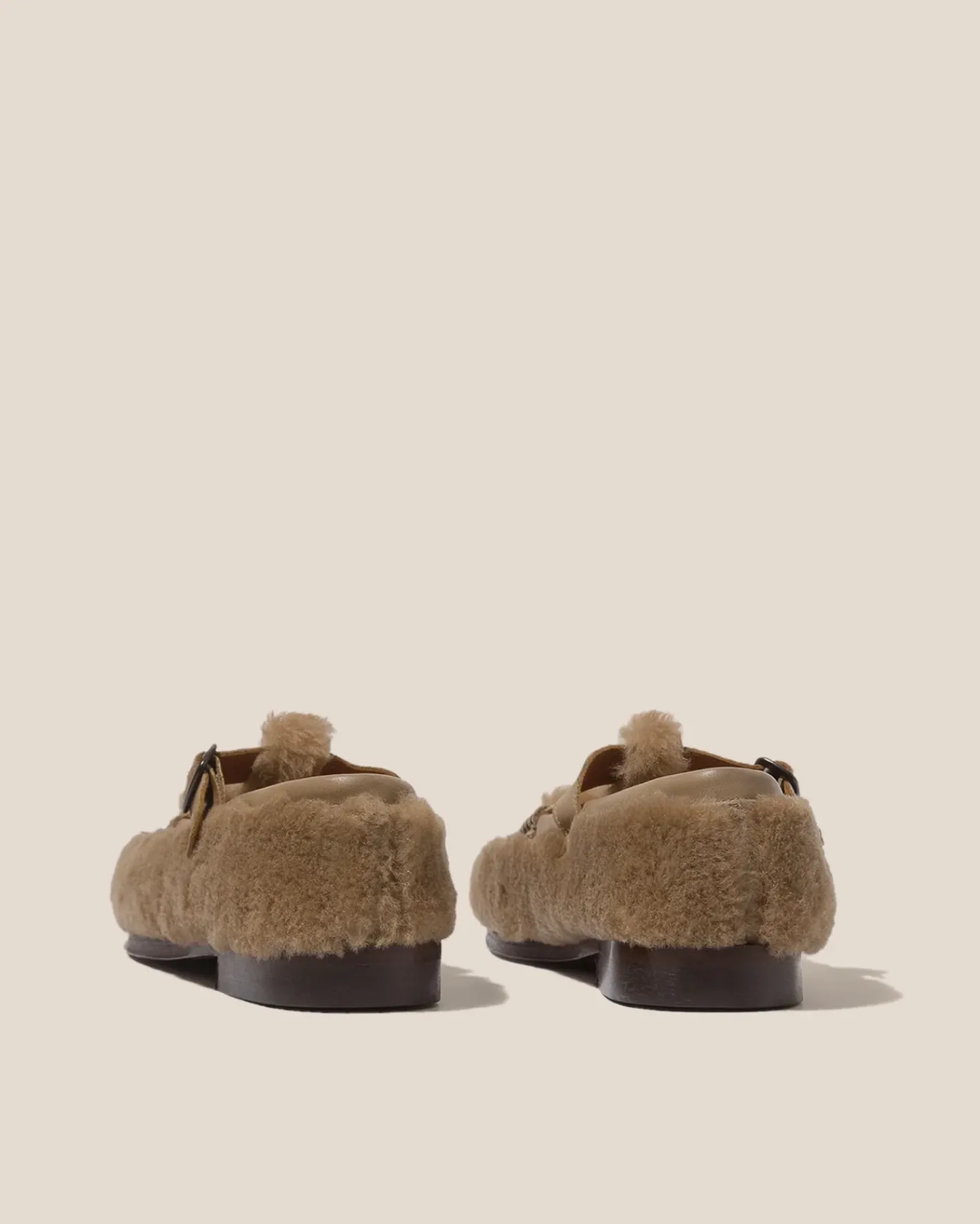 T-bar loafer crafted in light tan shearling with smooth leather trims. Handsewn using the traditional moccasin construction.