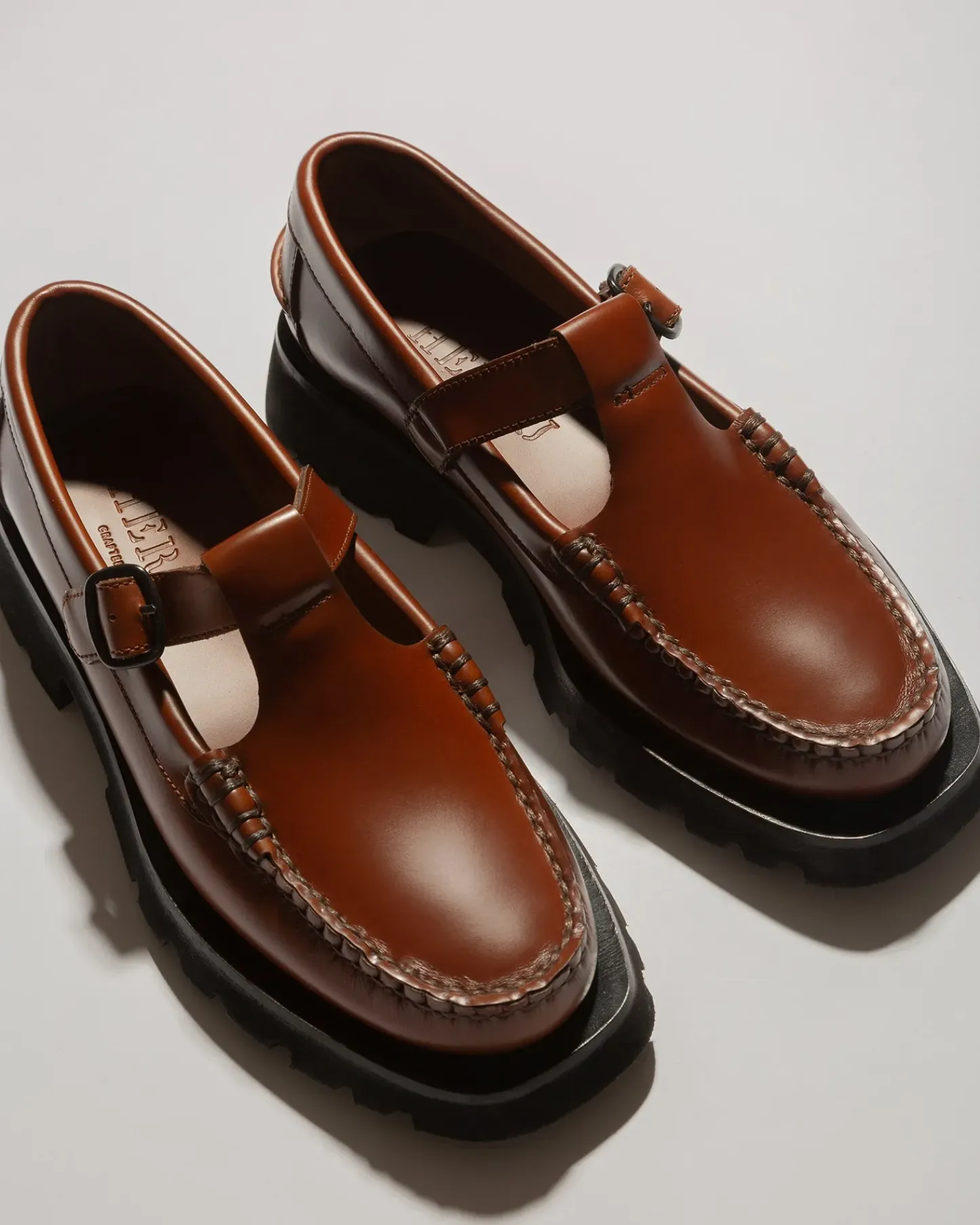 T-bar loafer crafted in Spanish calf leather updated with a blown rubber tread sole. Hand-sewn using the traditional moccasin construction.