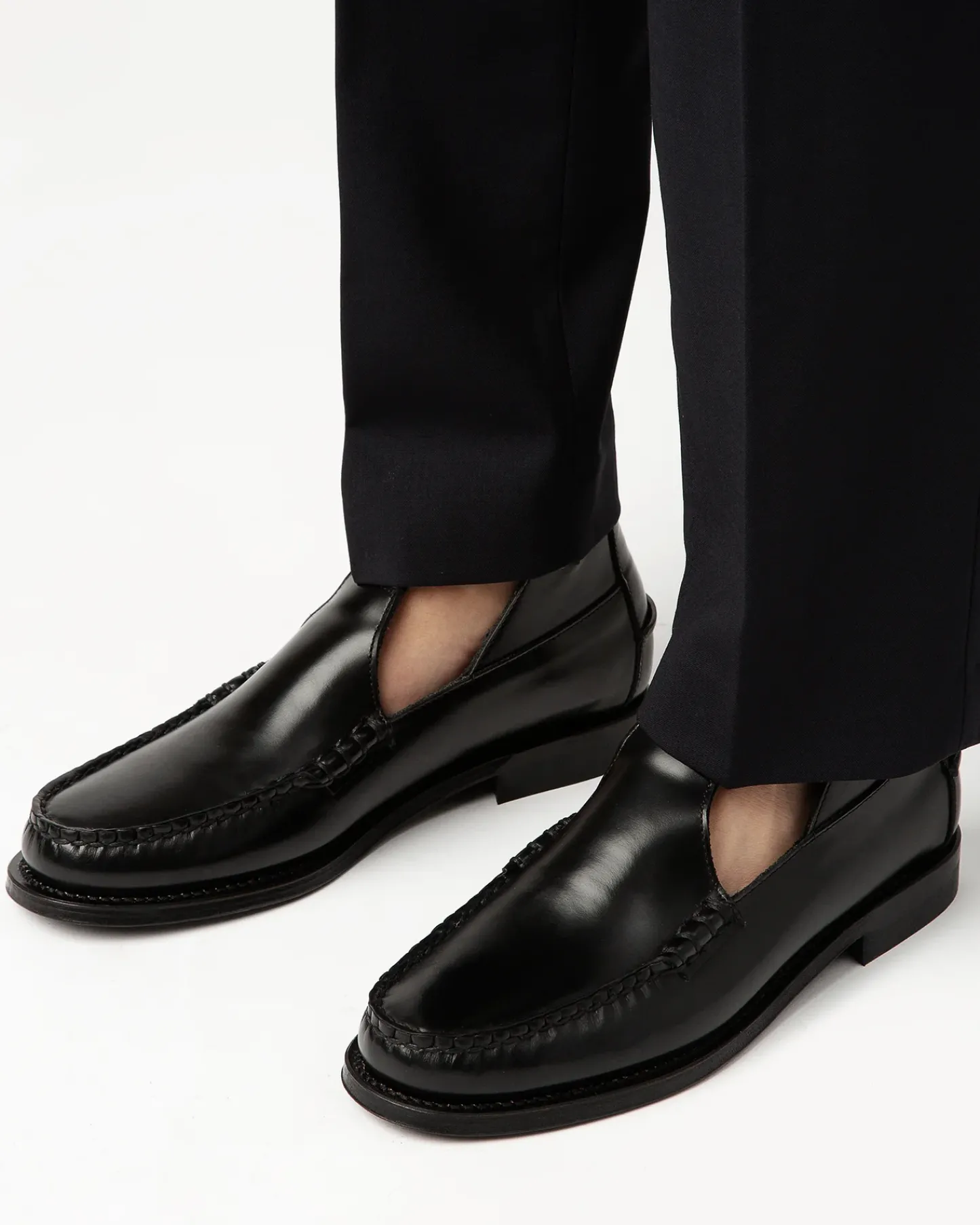 T-bar ankle boot with leather sole crafted in structured calf. Hand-sewn using the traditional moccasin construction.