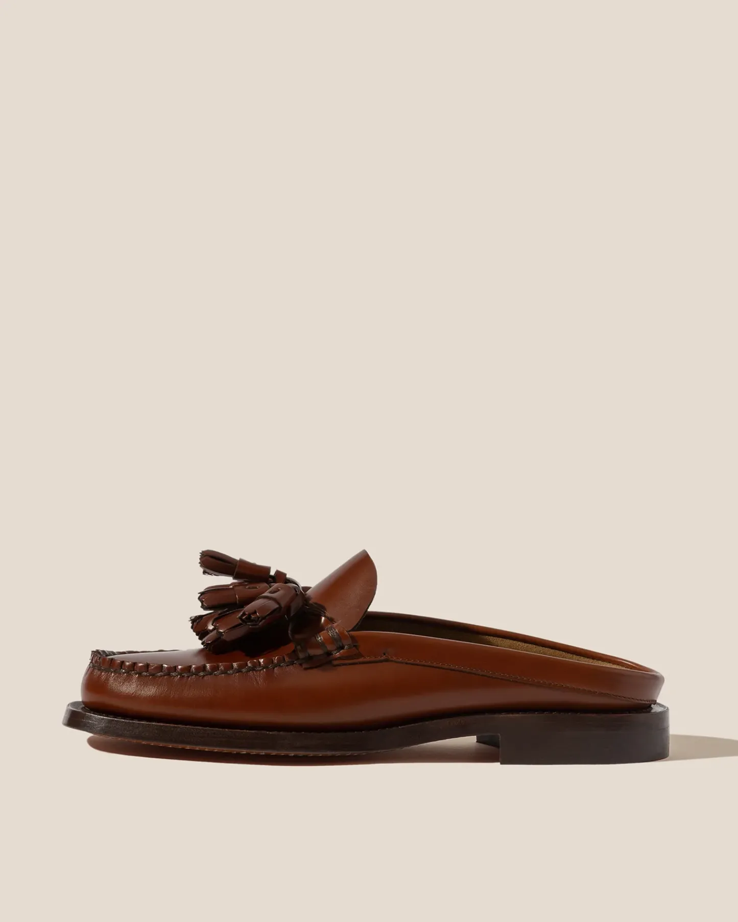 Tasseled mule loafer crafted in Spanish full grain leather. The upper has been hand sewn using the traditional moccasin construction. The outsole is stitched to the upper for extra flexibility and durability.