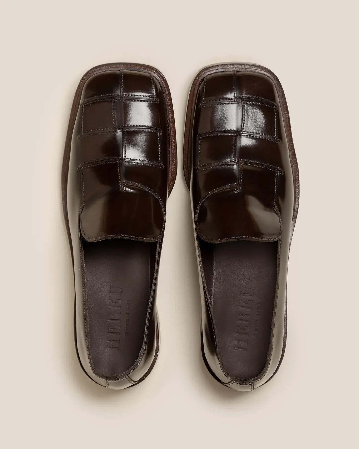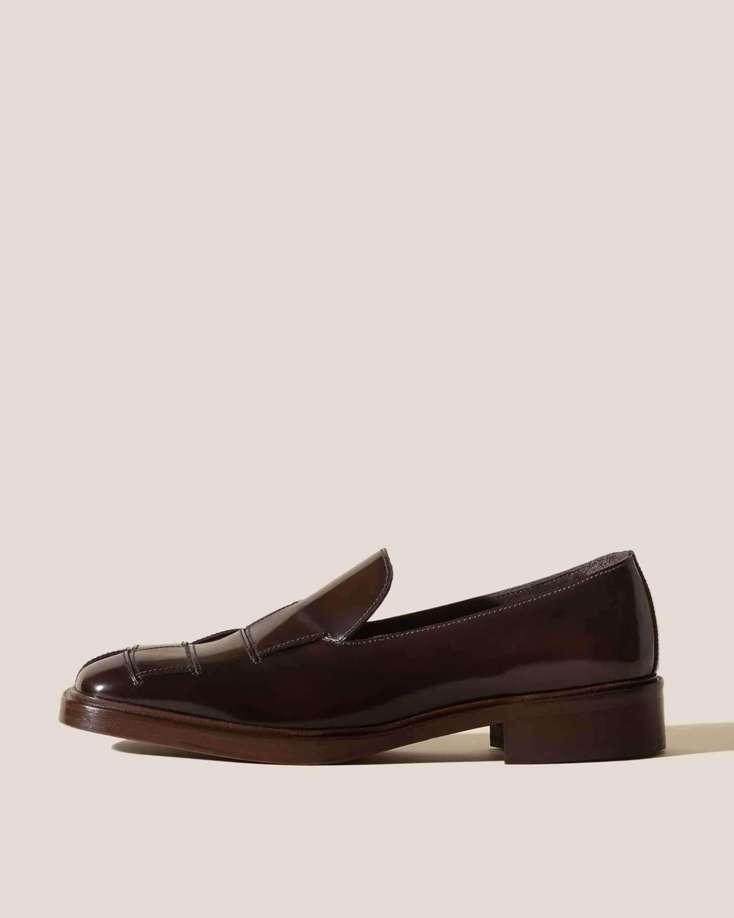 Interwoven slip-on shoe crafted in polished structured calf leather.