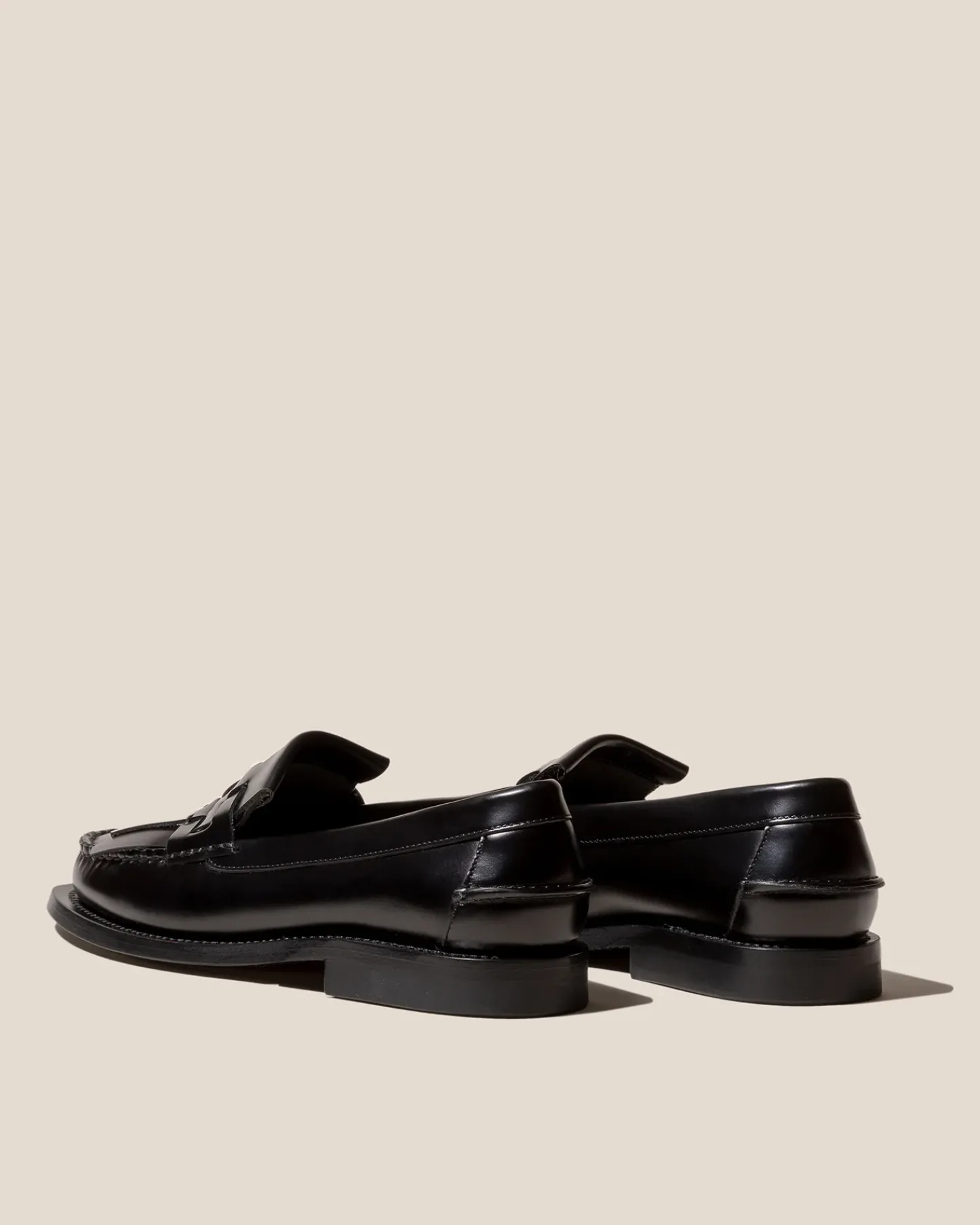 Slip-on loafer with interwoven fringes front detail crafted in structured calf.