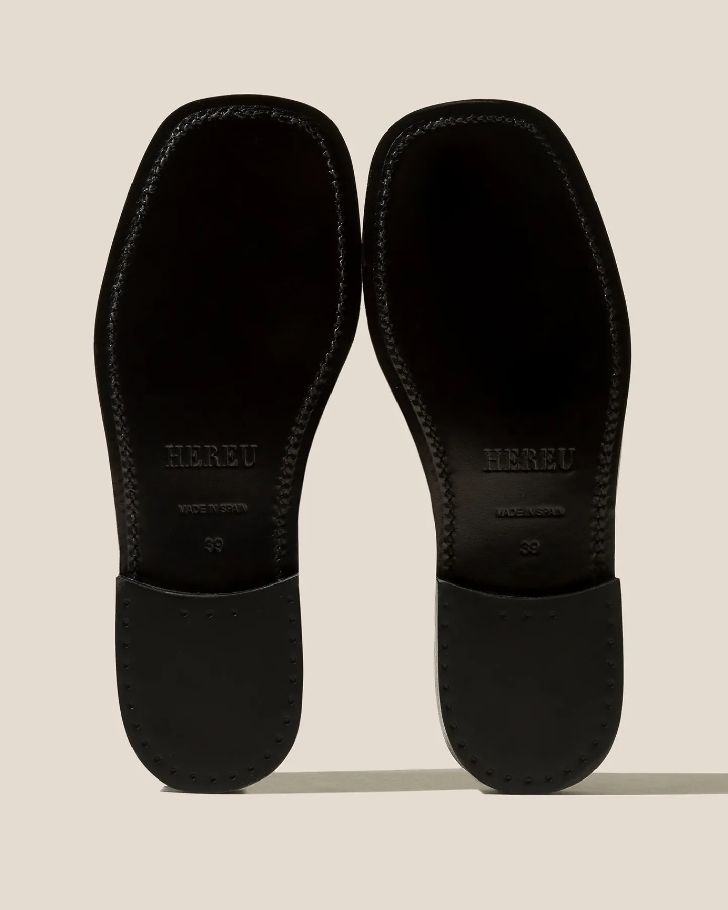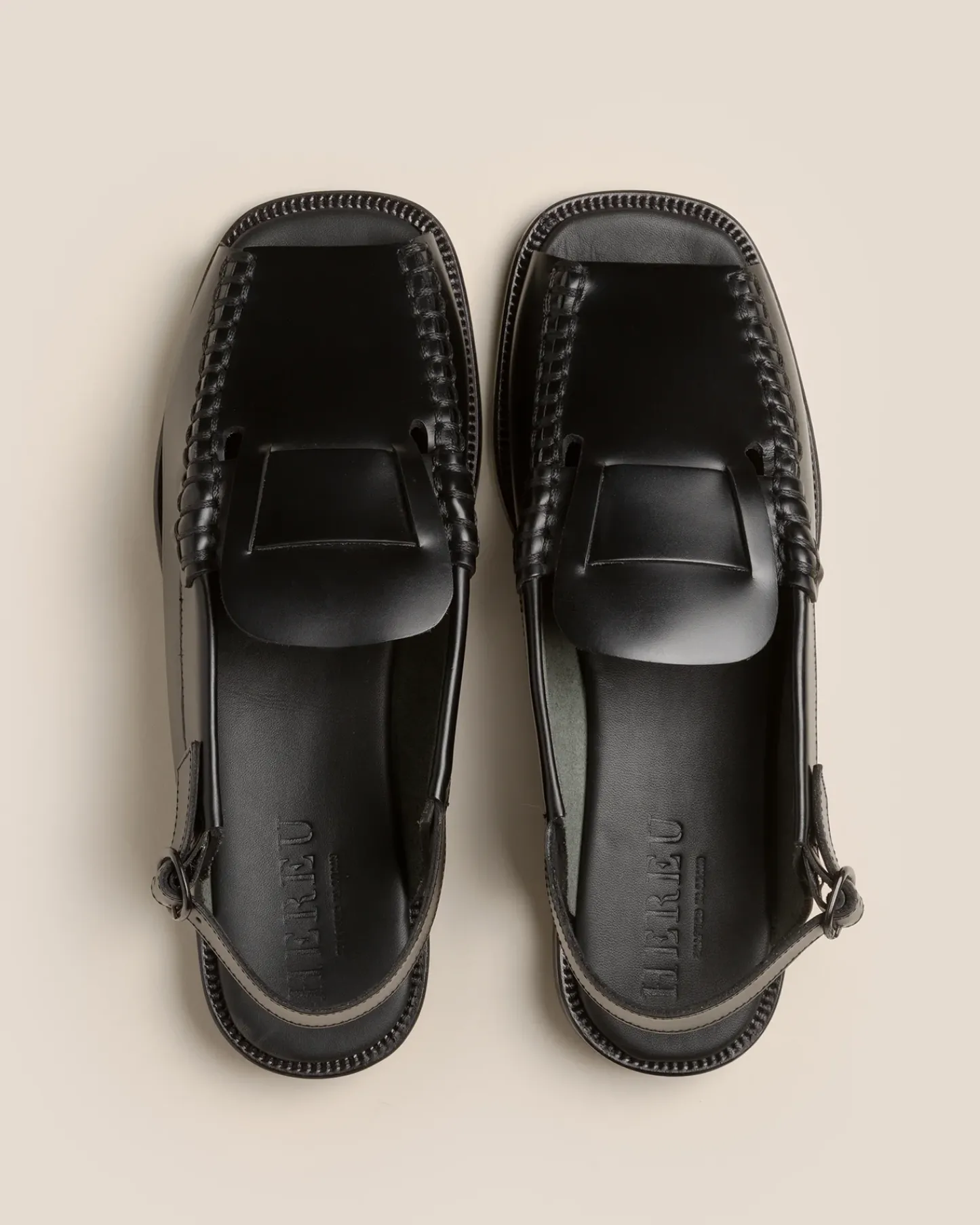 Opened-toe slingback loafer with interlaced front detail crafted in Spanish structured calf leather.