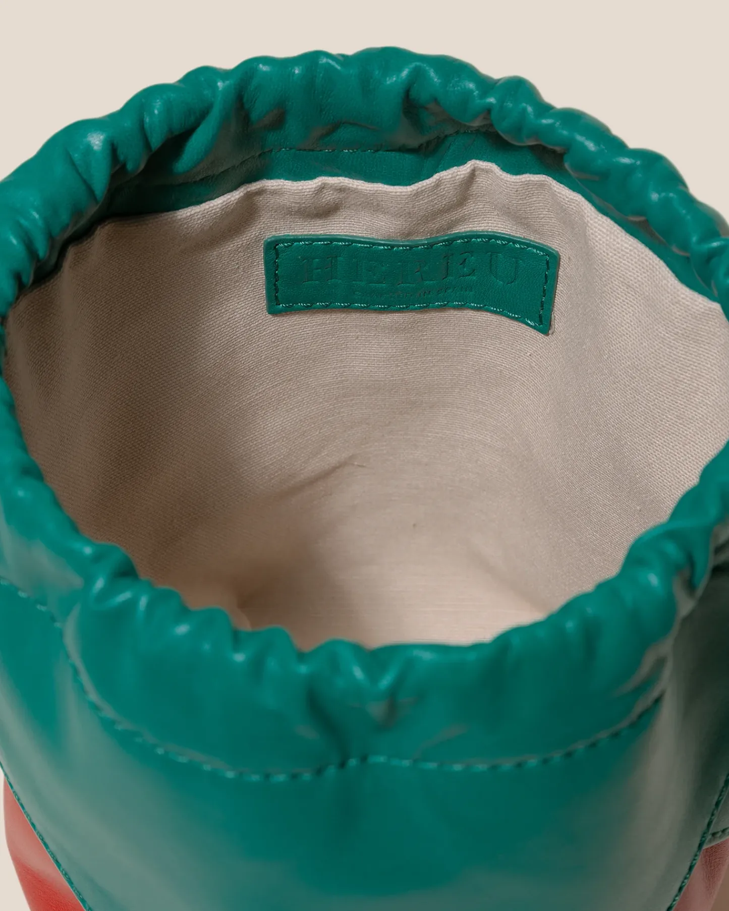 Strawberry-shaped small handbag crafted from supple lambskin, featuring a drawstring fastening.