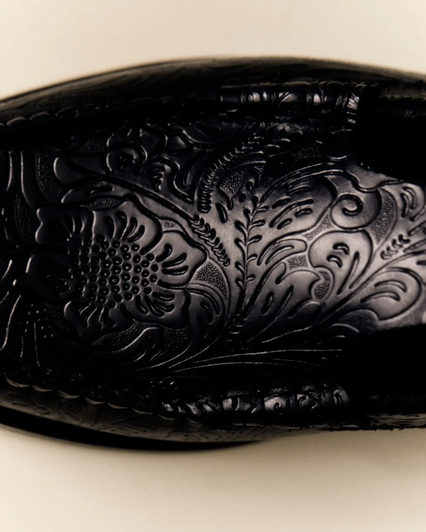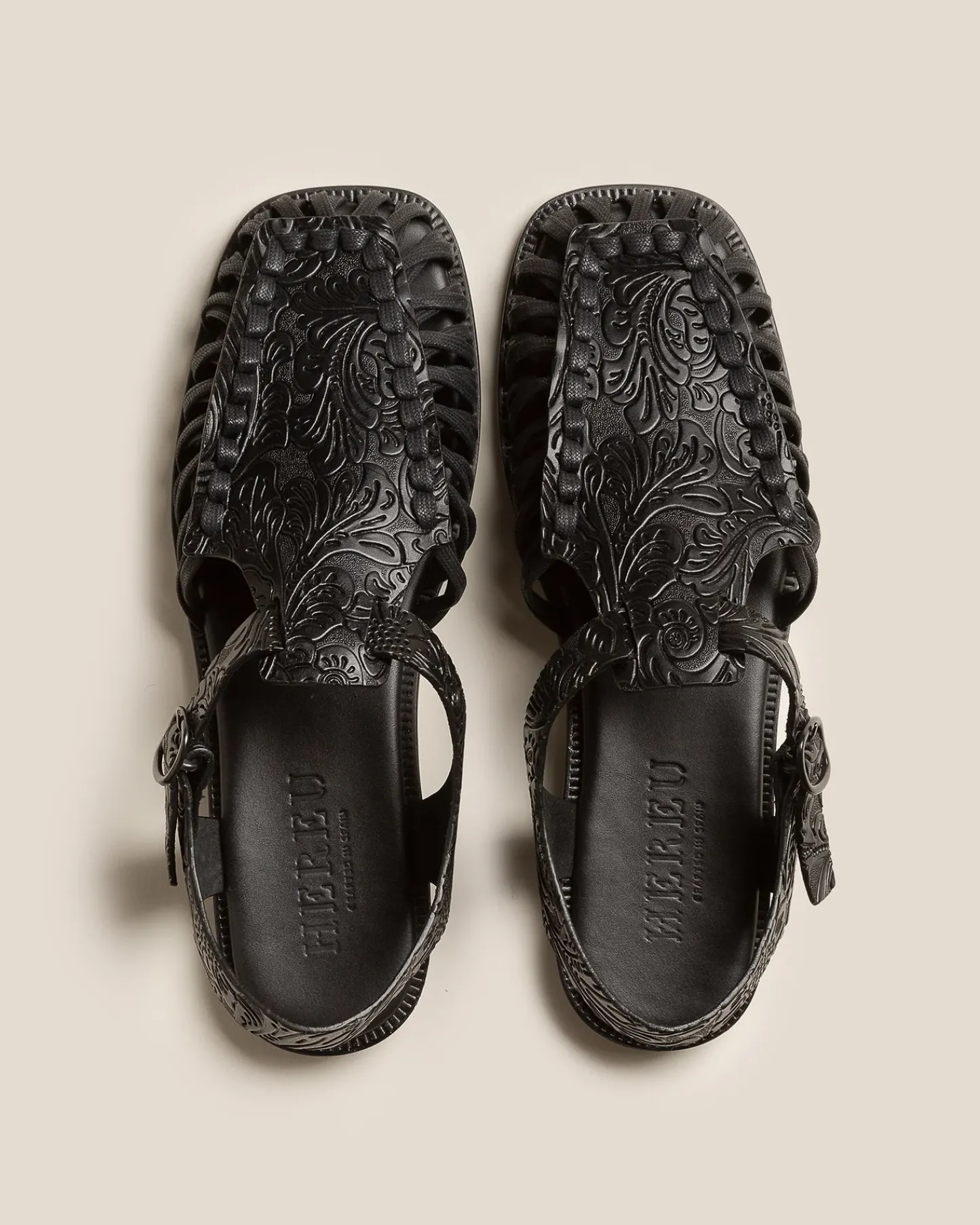 Square toe T-bar sandal with caged sides, crafted in embossed veg-tanned calf leather.