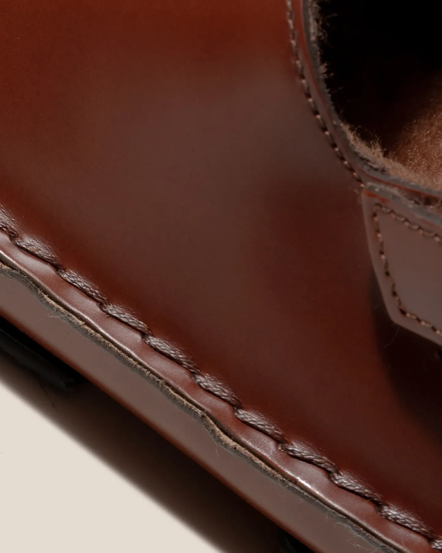 Slingback clog with shearling lambskin interior and whipstitch detail constructed on a lightweight wedge.