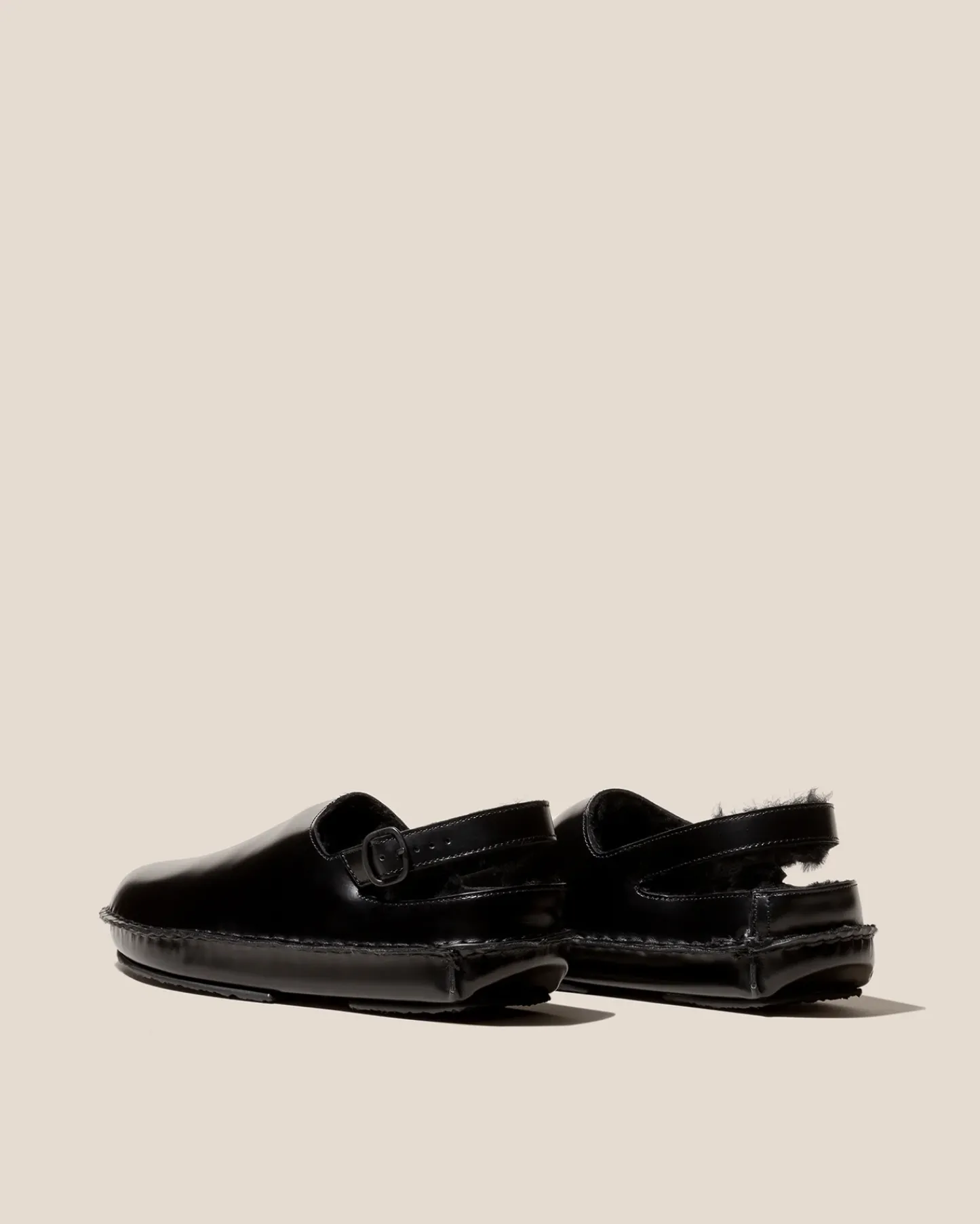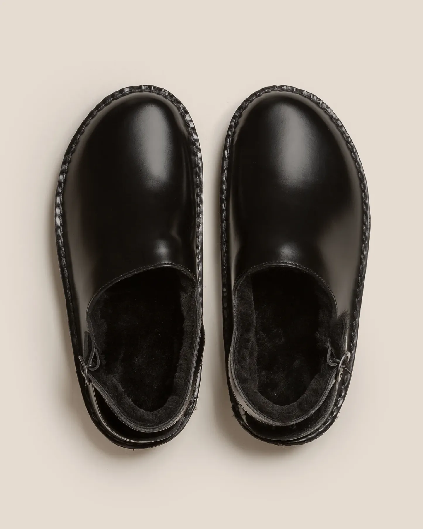Slingback clog with shearling lambskin interior and whipstitch detail constructed on a lightweight wedge.
