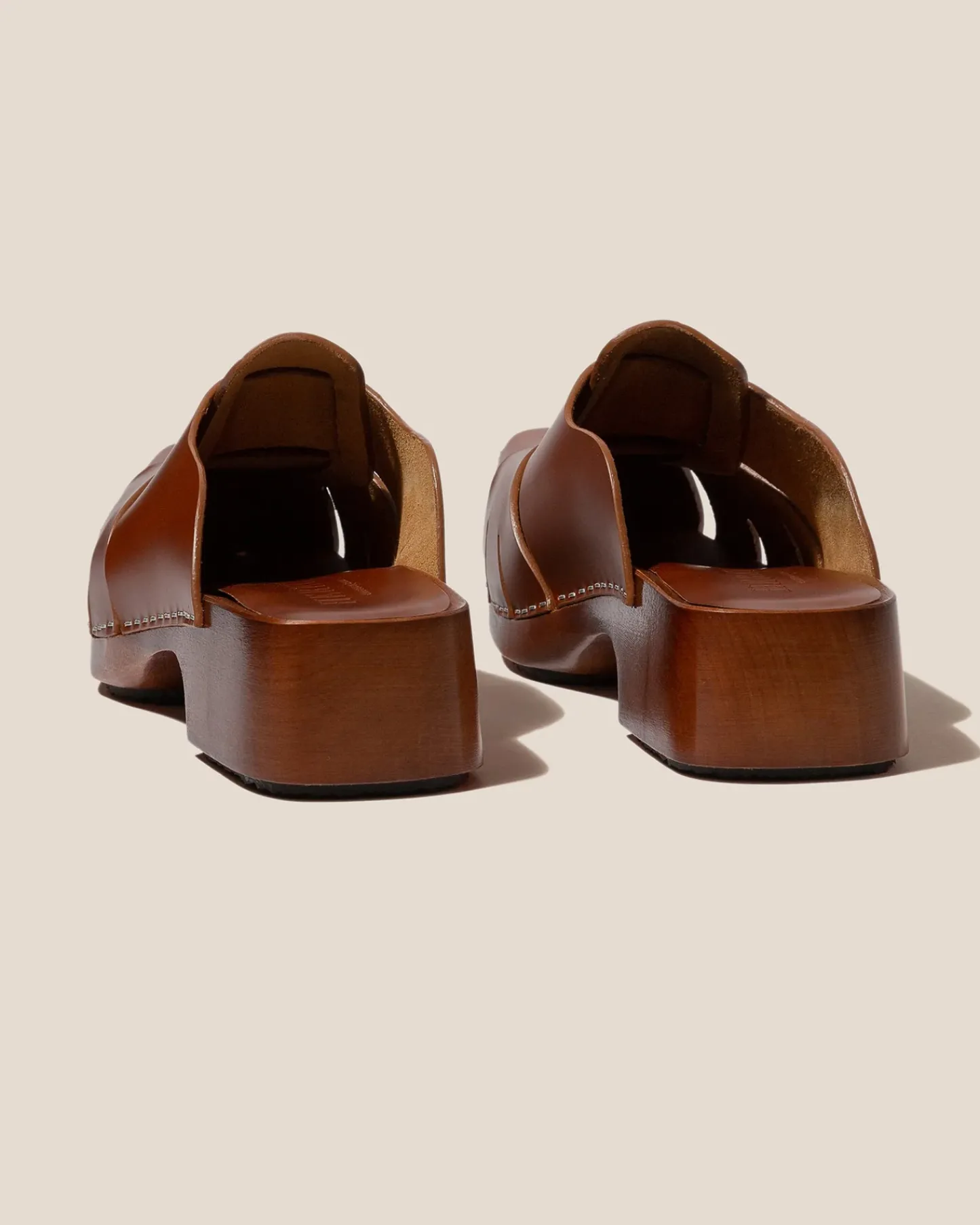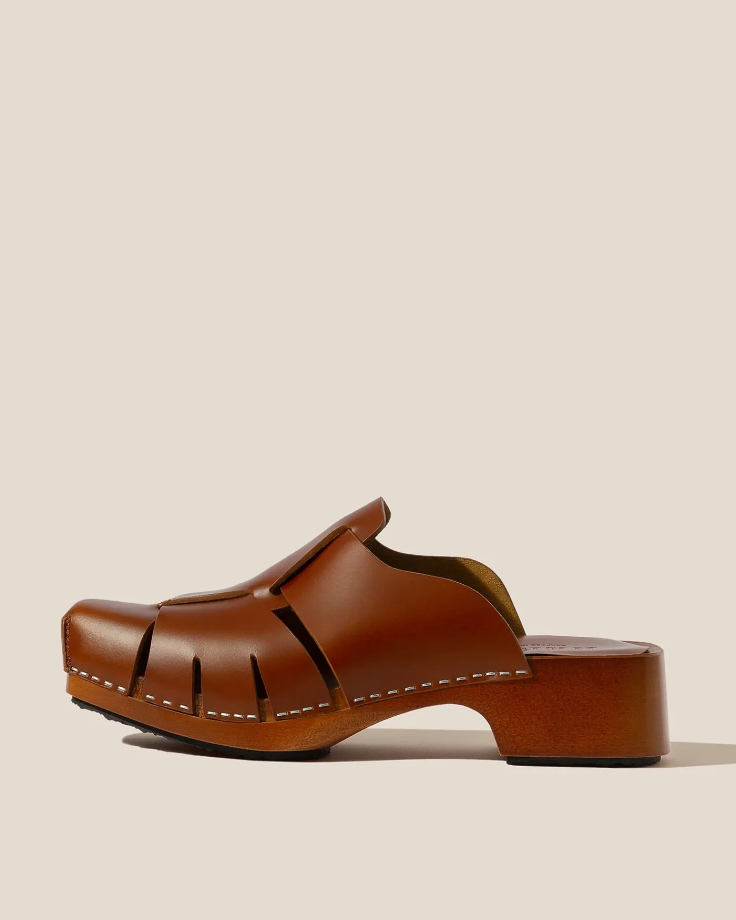 Square toe wooden mule clog with fisherman-sandal details. Crafted in Spanish full-grain leather and hand-carved wooden sole.