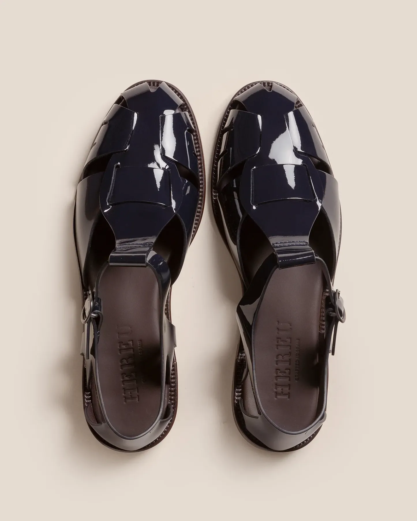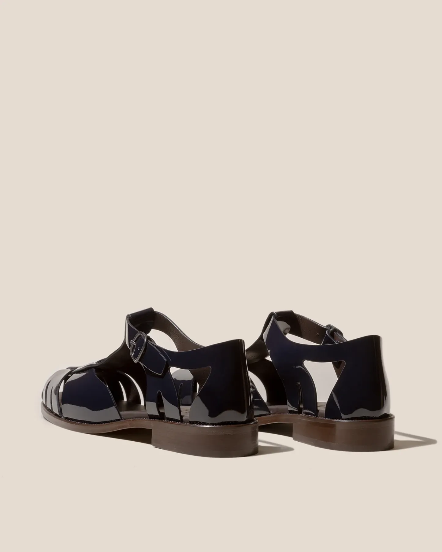 Round-toe fisherman sandal with cut out front detail, crafted in crinkled glossy calf leather.
