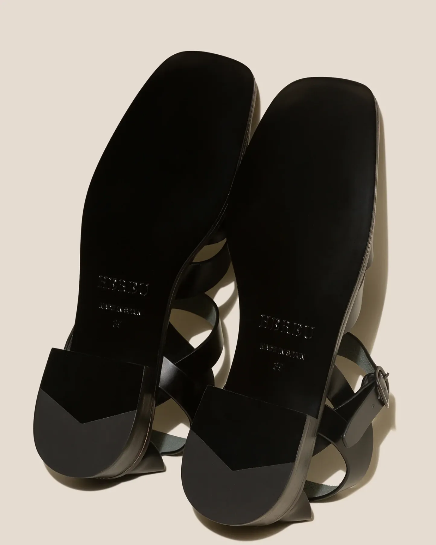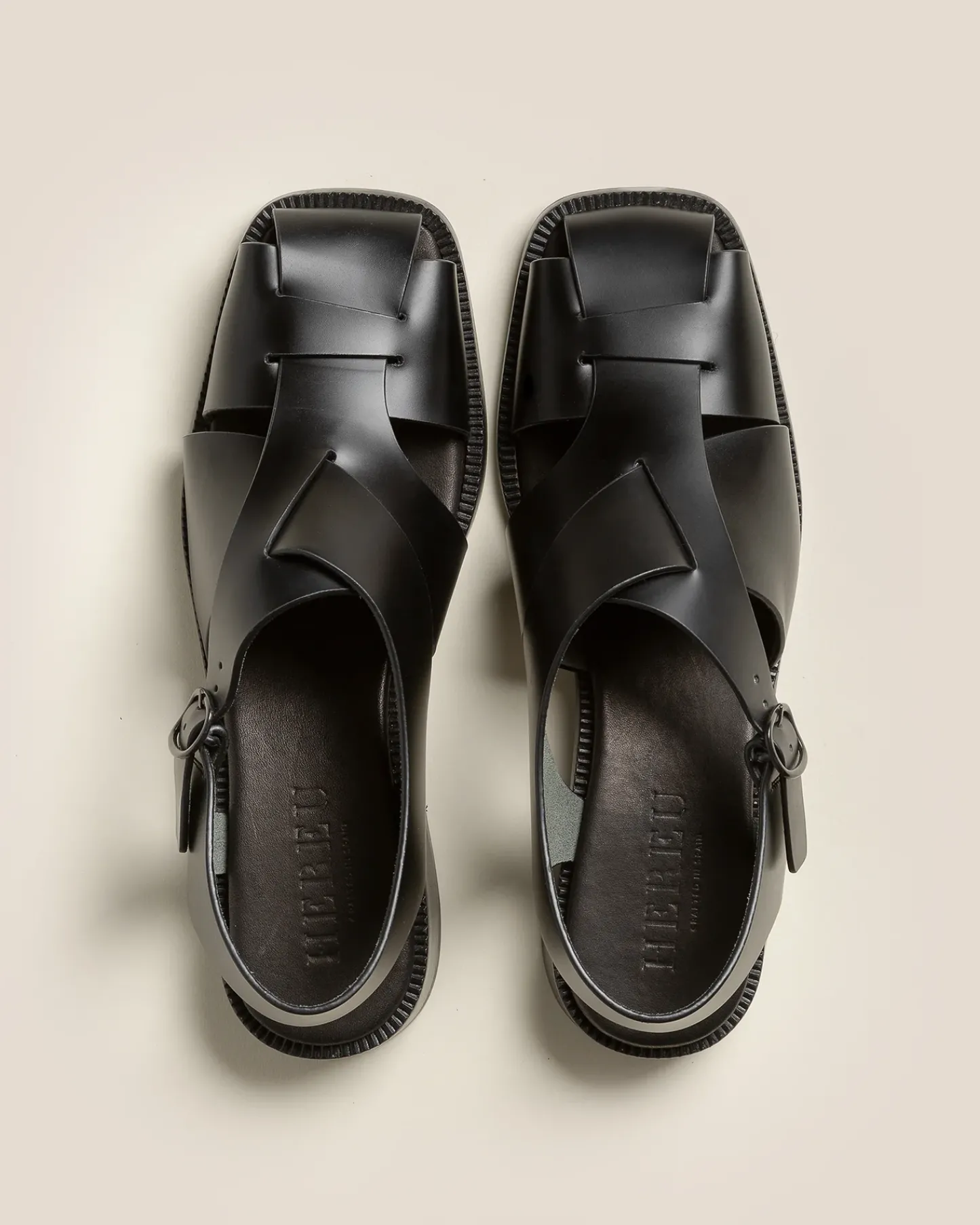 Square-toe asymmetrical fisherman sandal. Crafted in structured leather.