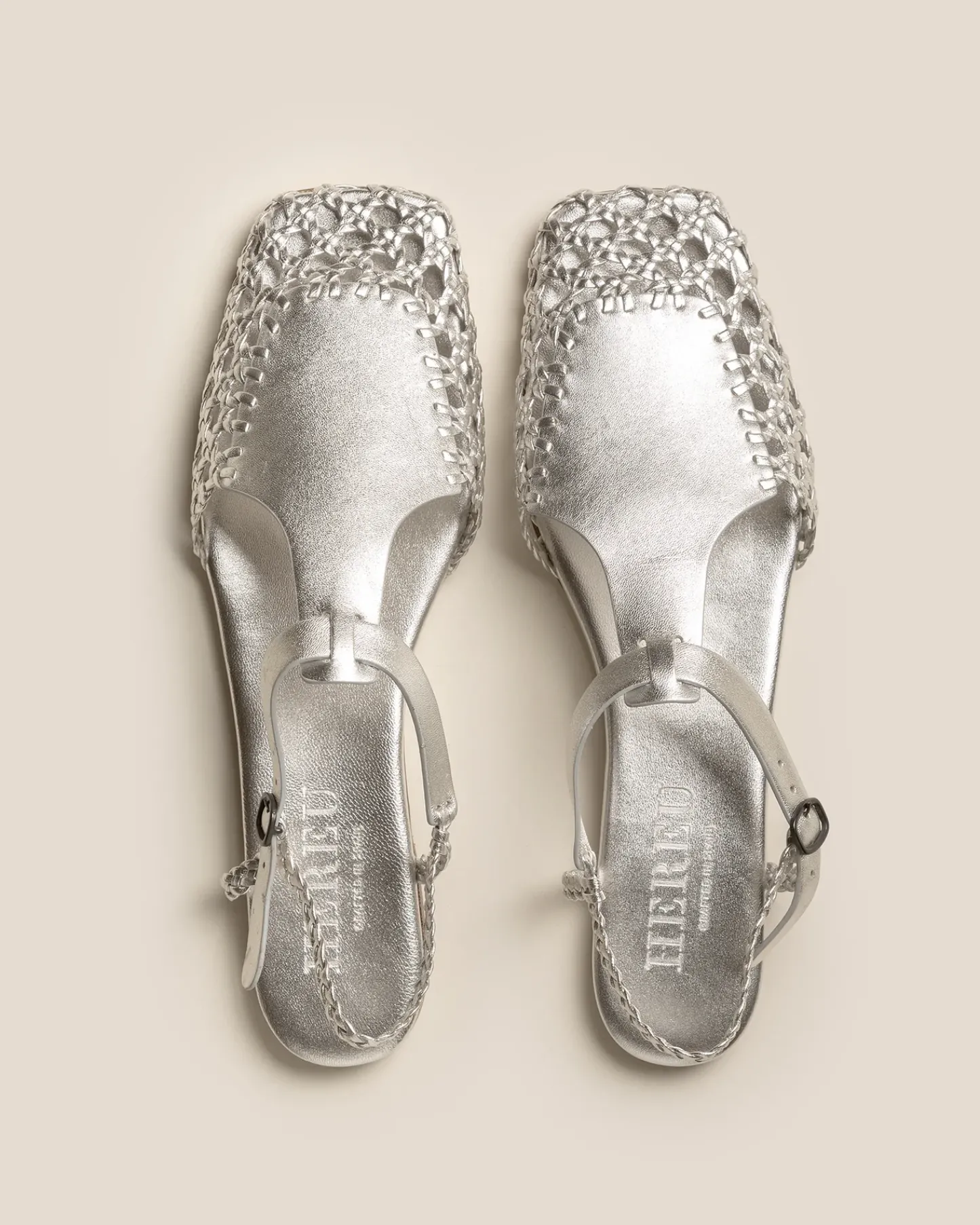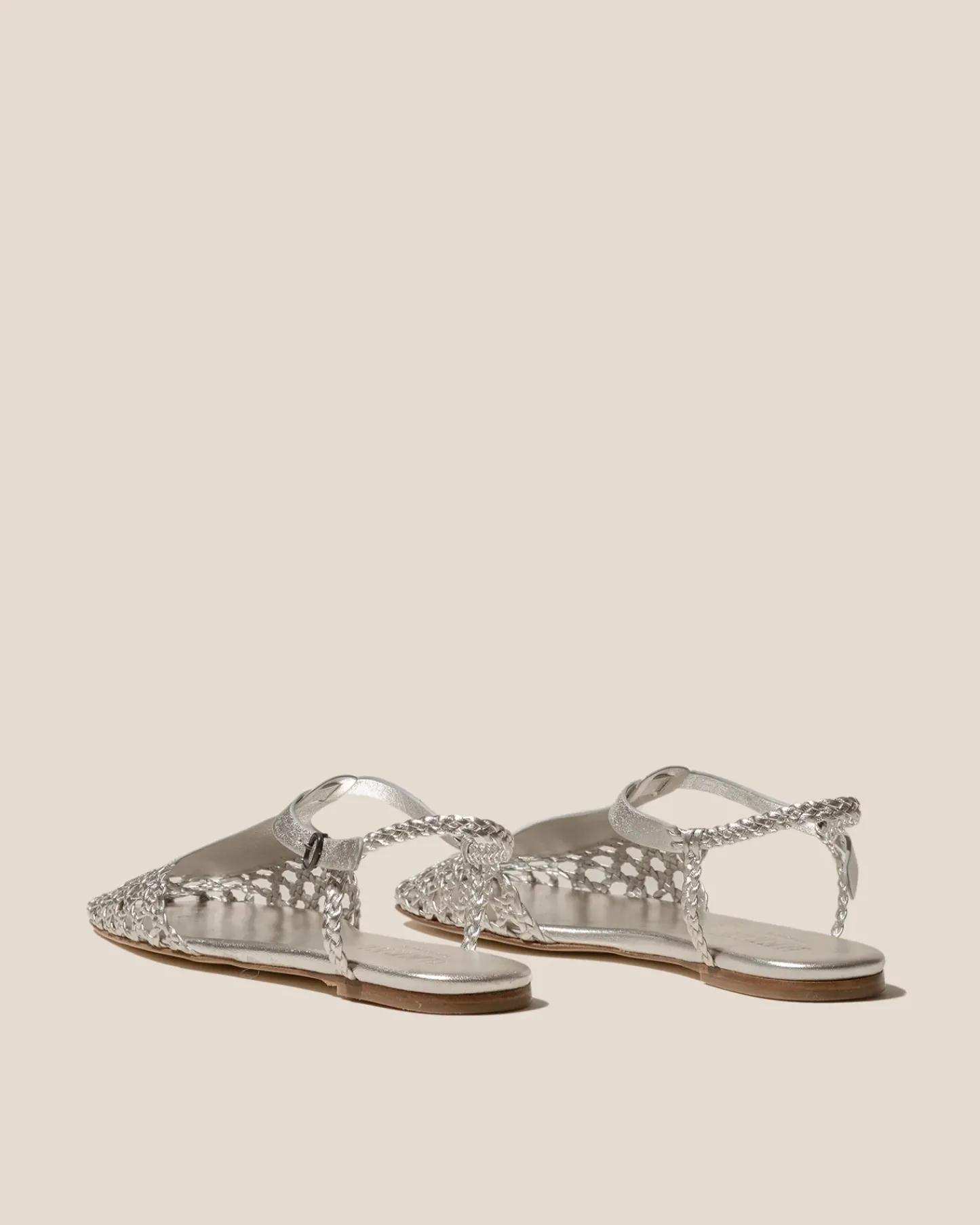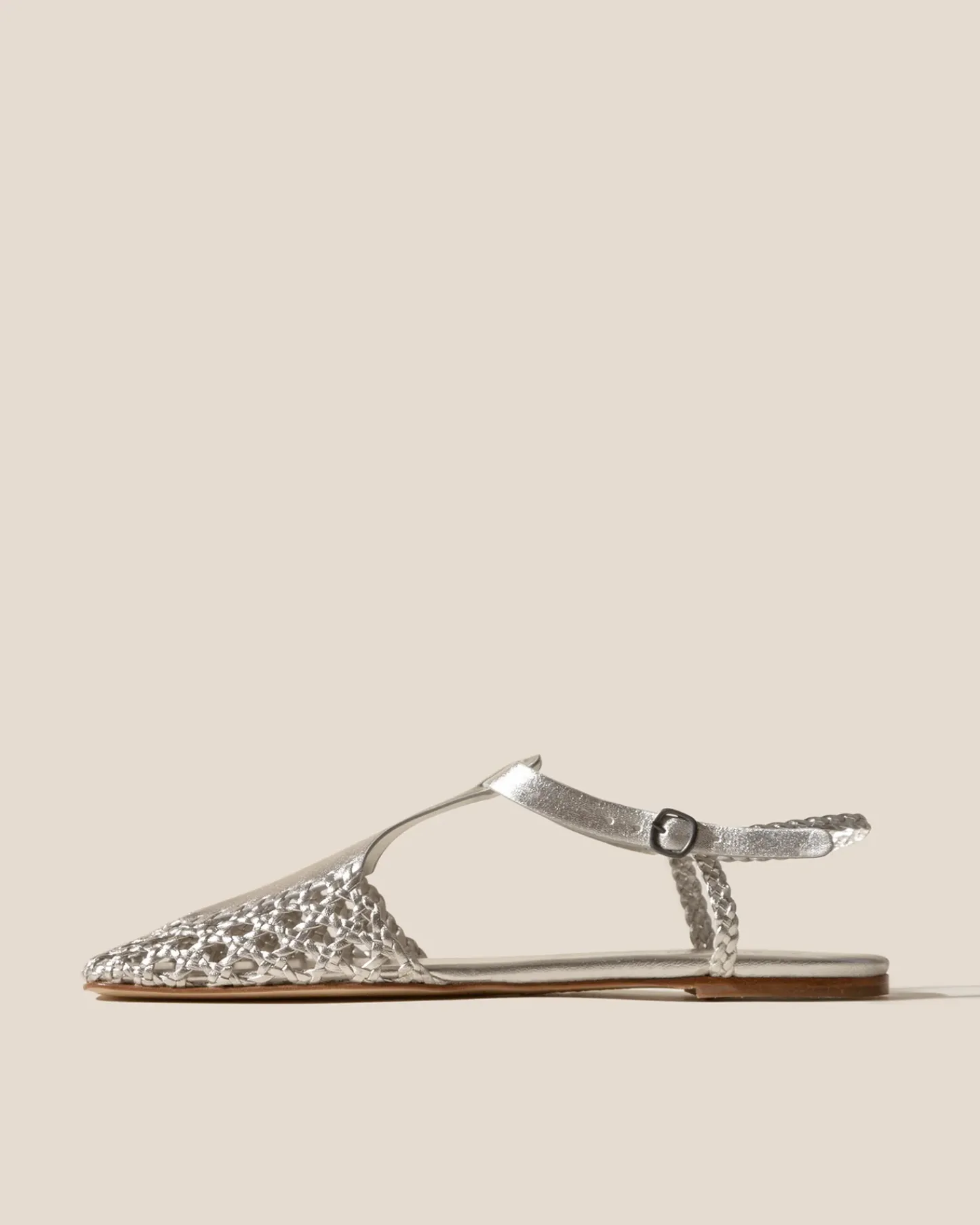 Square toe hand-woven t-bar sandal crafted in metallic calf leather.