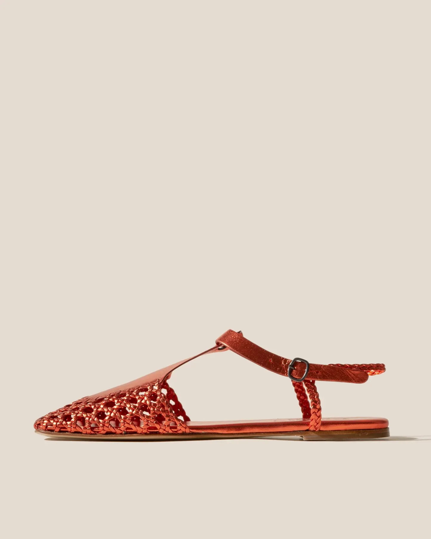 Square toe hand-woven t-bar sandal crafted in metallic calf leather.