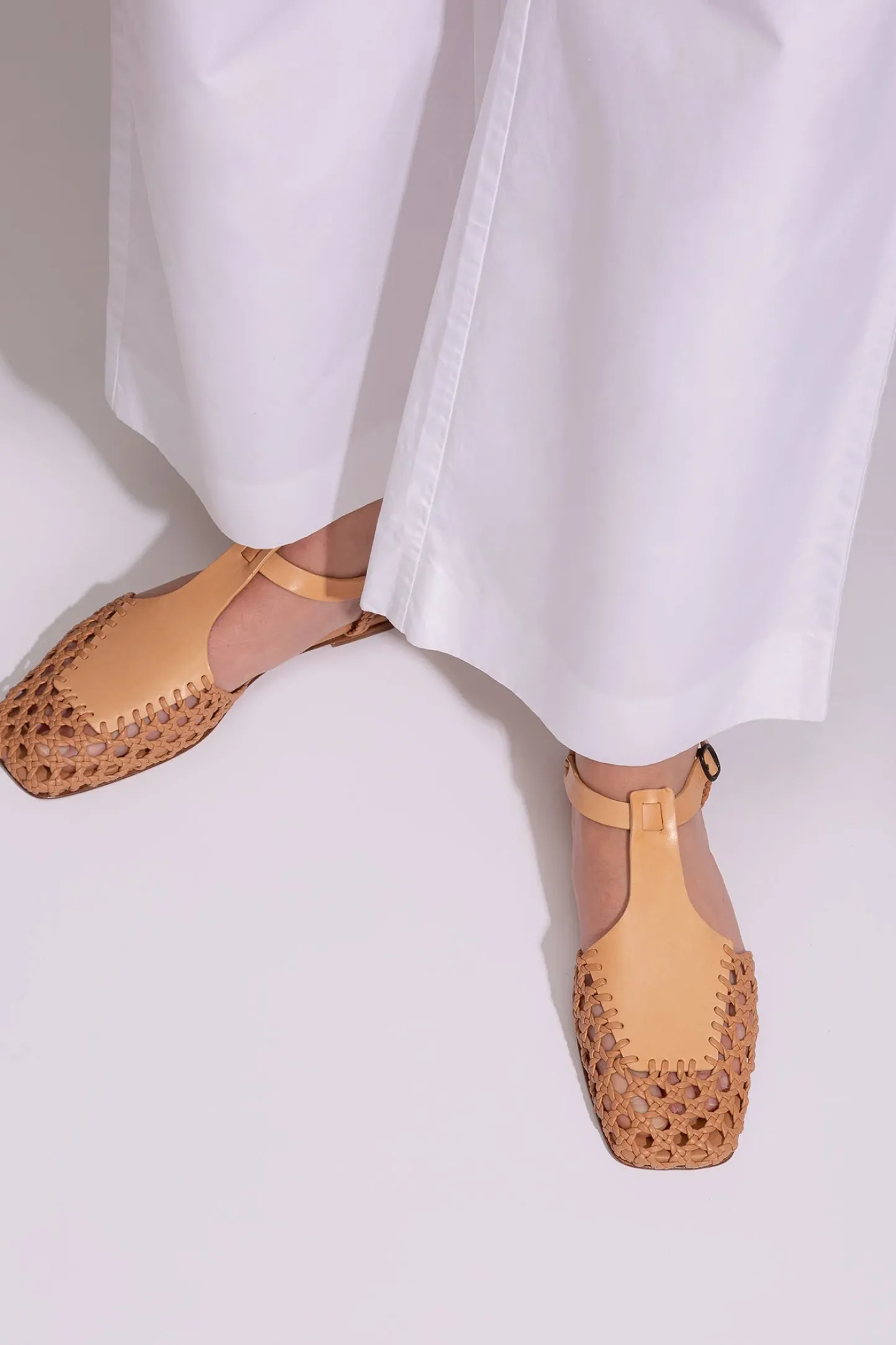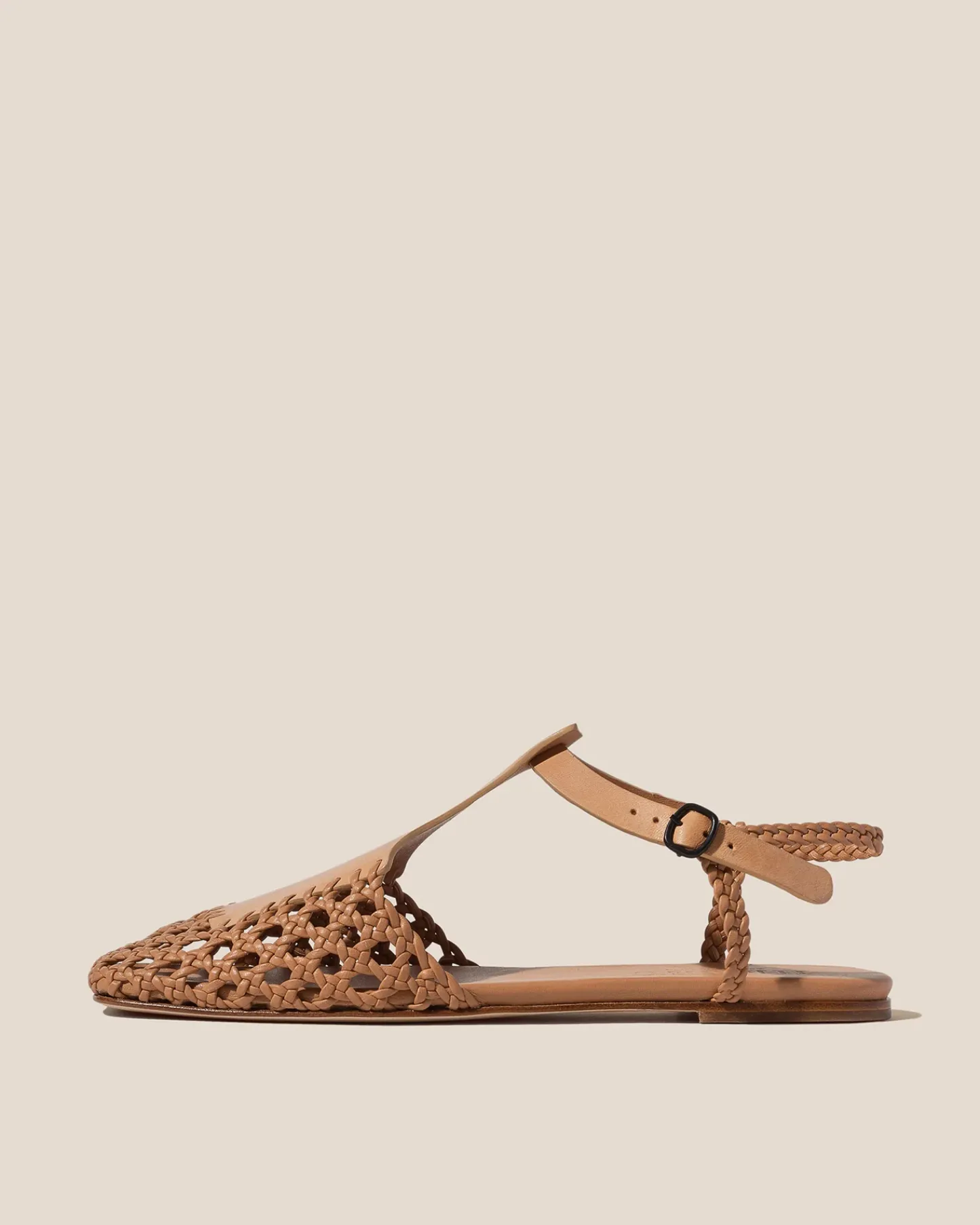 Square toe hand-woven t-bar sandal crafted in a combination of veg-tanned calf leather and supple lambskin.